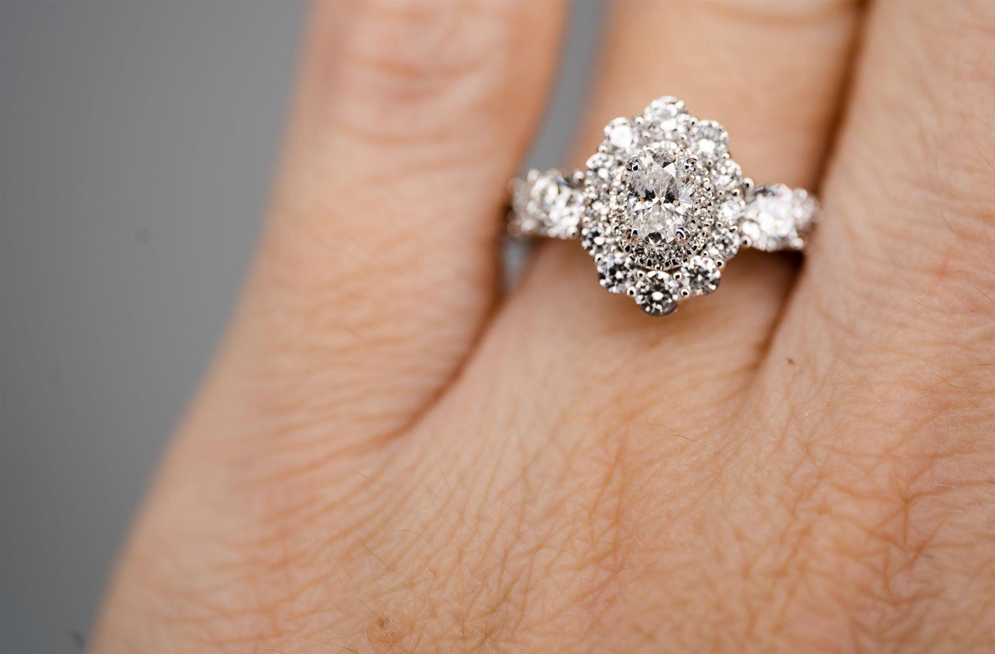 This is a 14K White Gold 1.33tdw Double Halo Diamond Oval with Two Large Round Accent Diamonds.