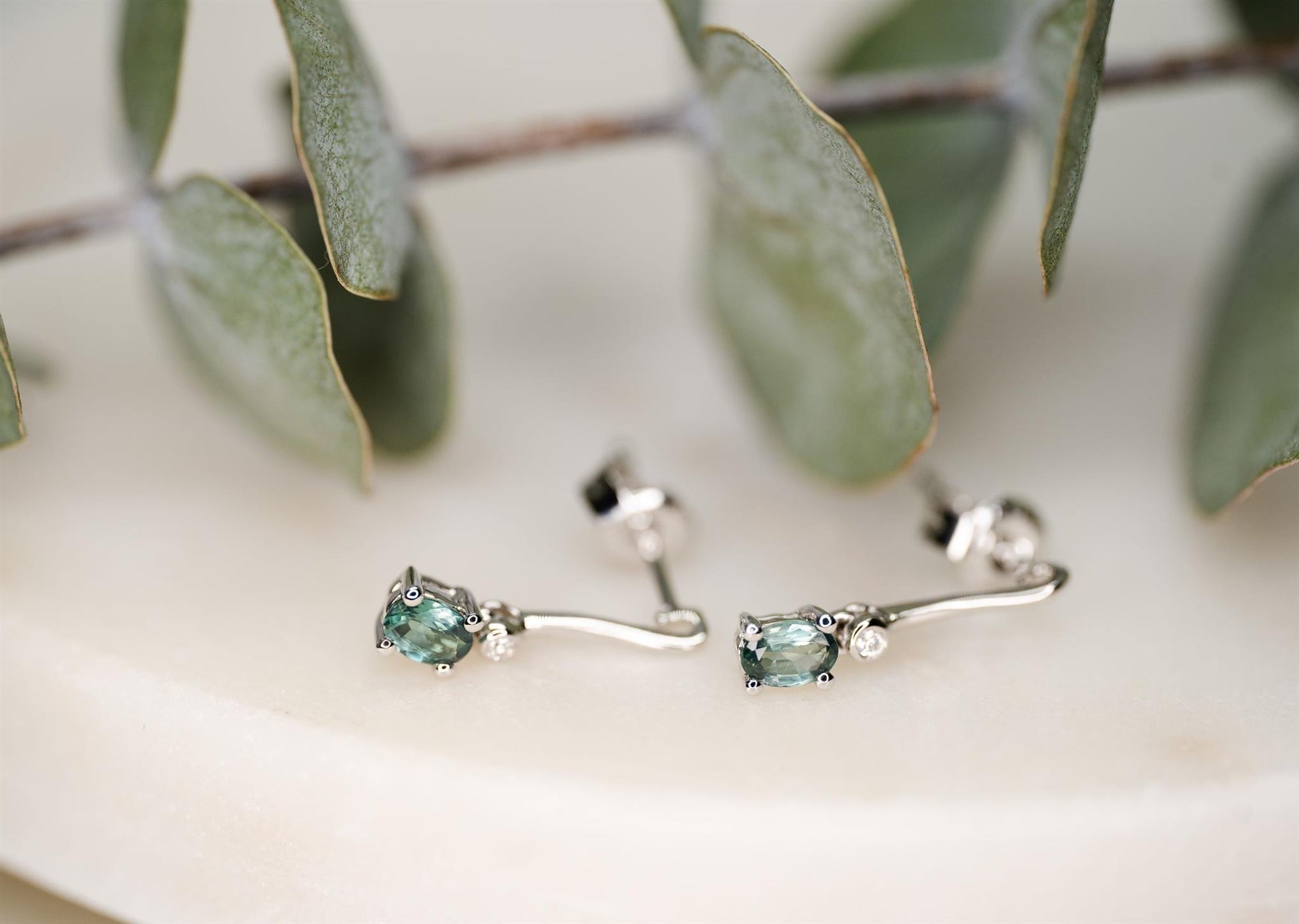 These are 14K white gold earrings with a 3x4mm oval, teal, alexanderite stone and one small white diamond at the top of each alexanderite. Total diamond weight of both earrings is 0.12tdw.