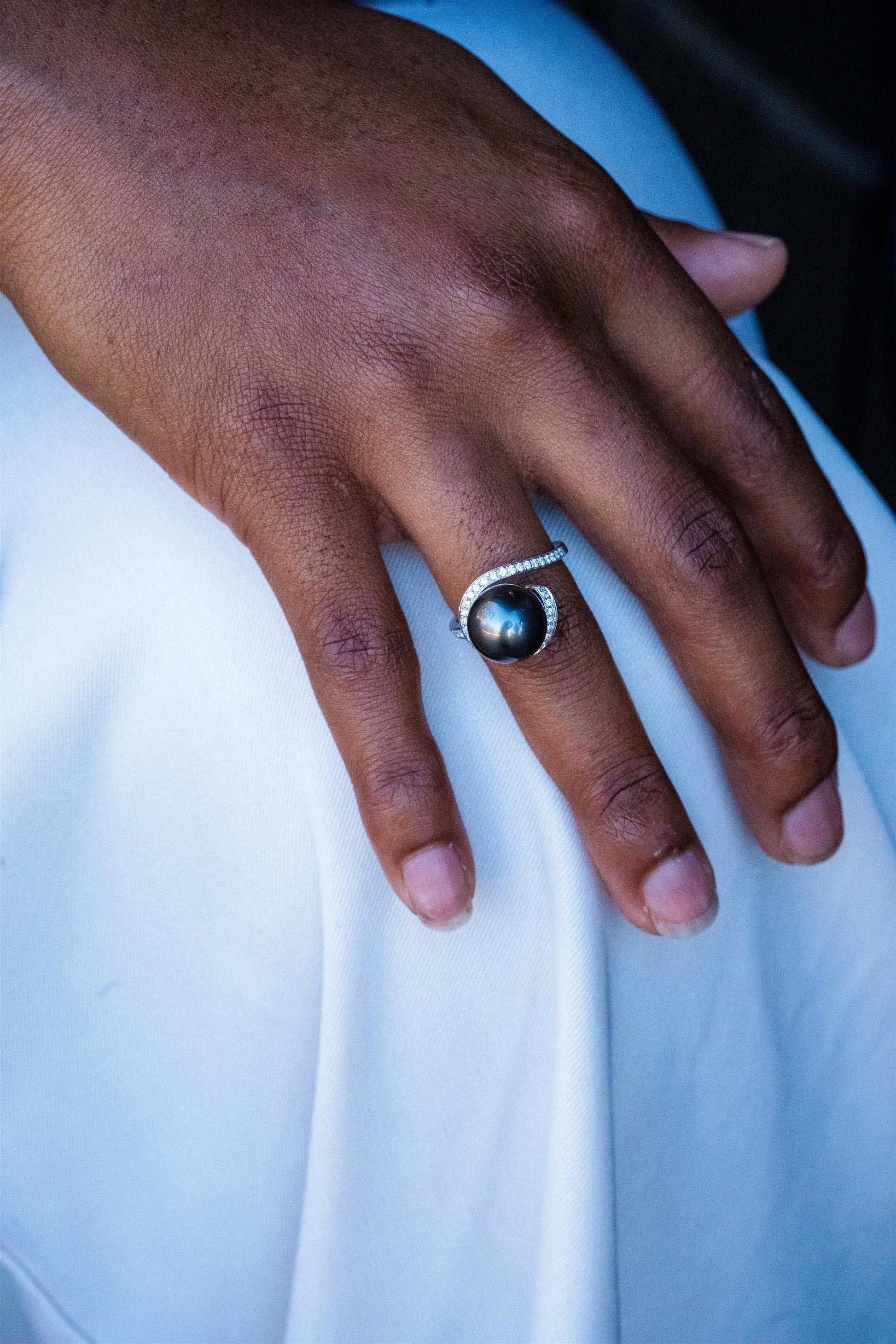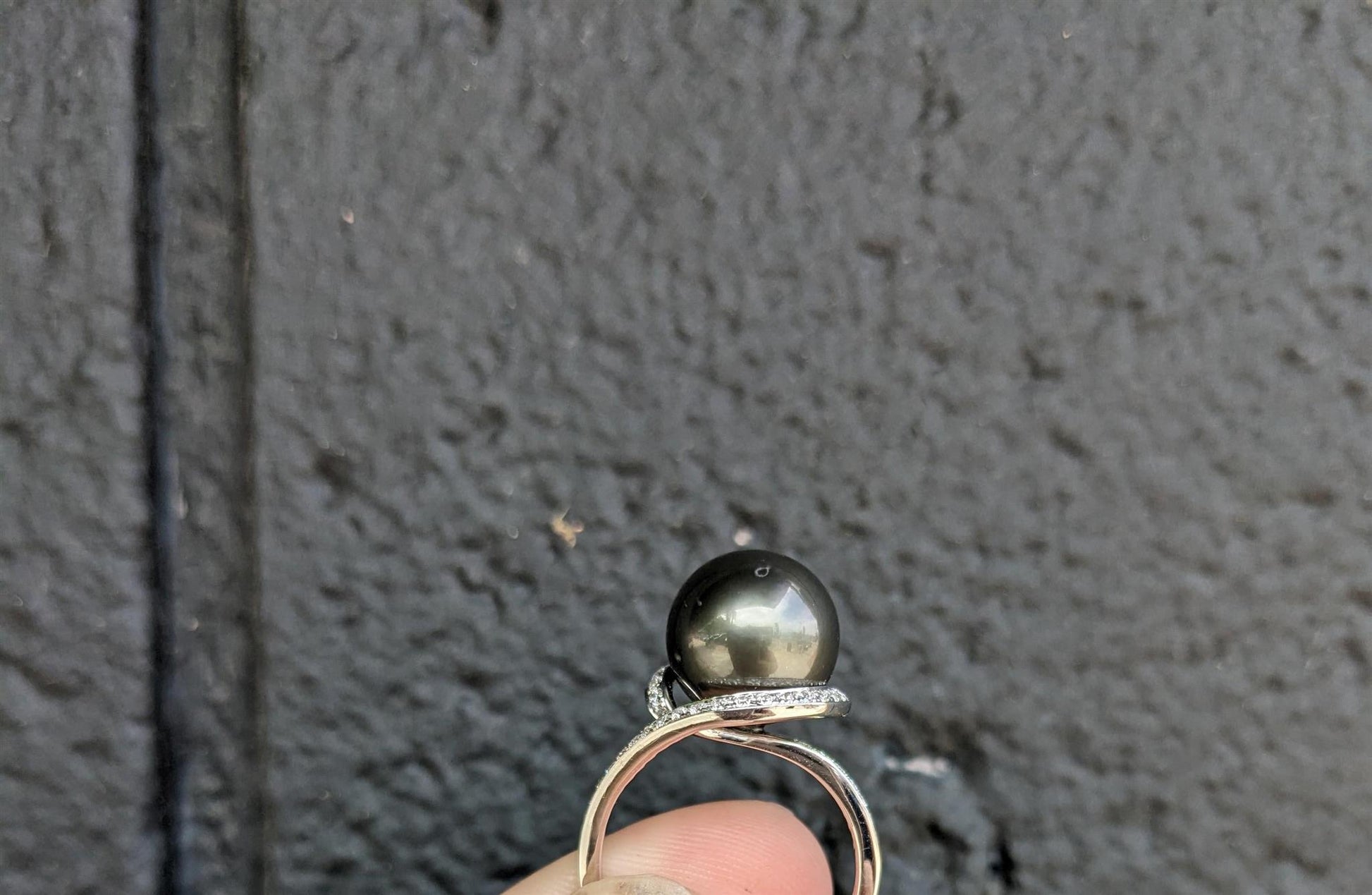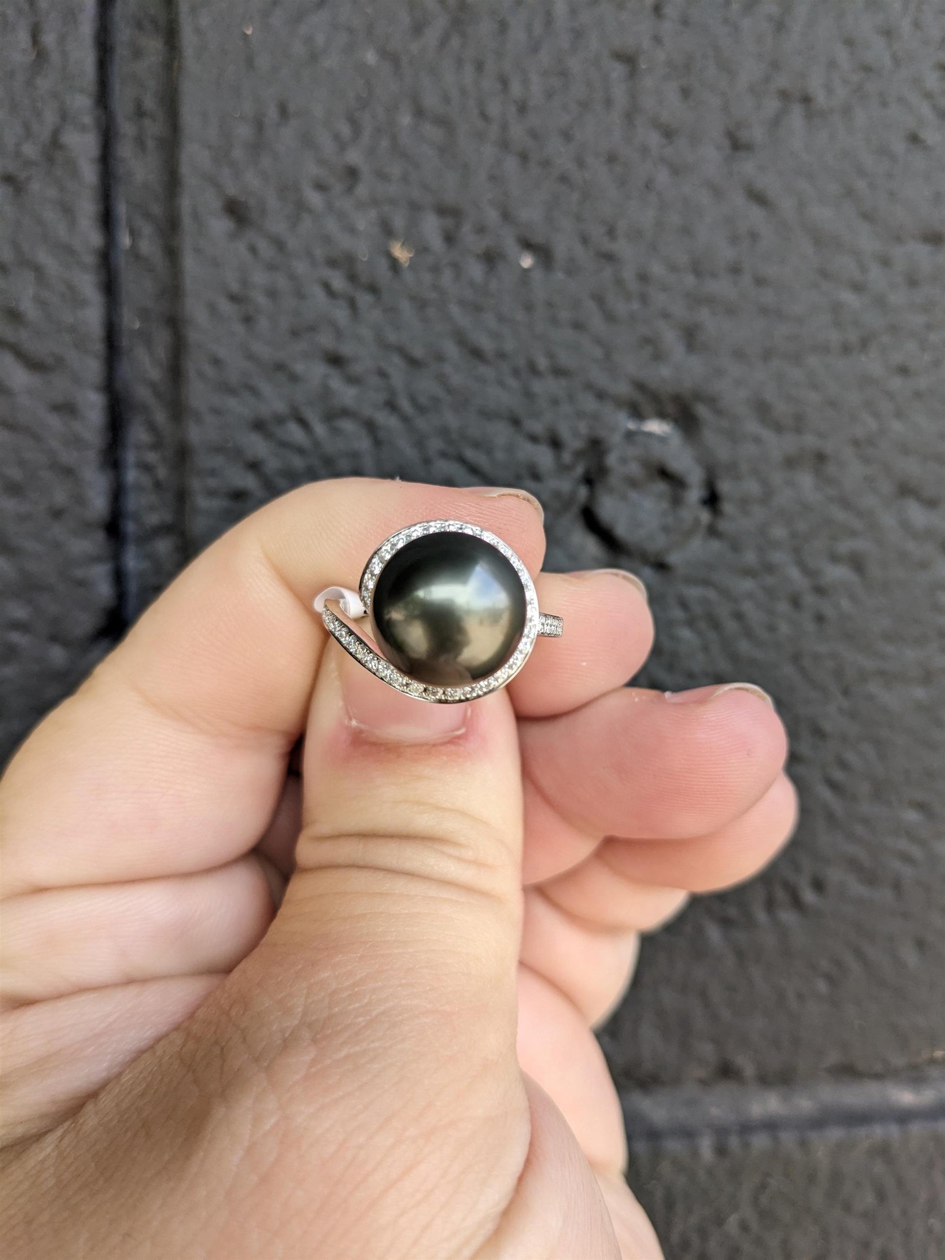 14k white gold ring with a 10-11mm saltwater tahitian pearl set in the center of the diamond swirl and diamonds down the band, 43 round diamonds =0.292tdw