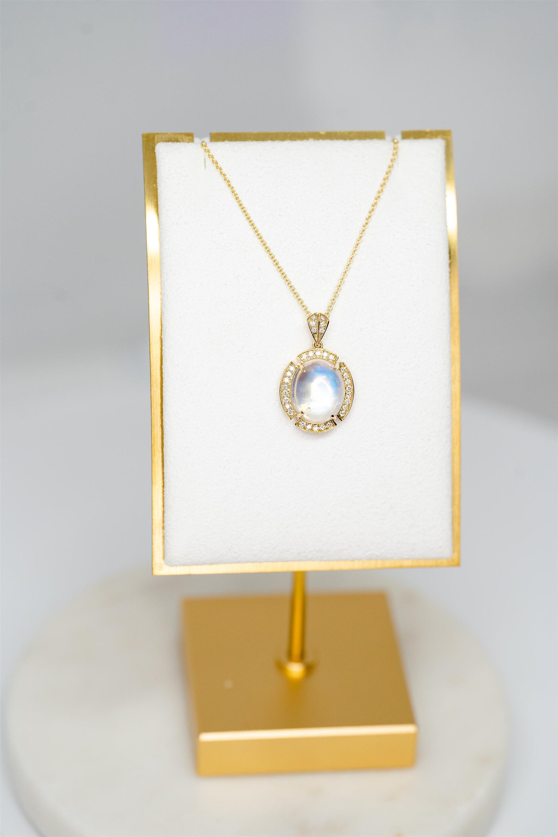 14K Yellow Gold 5.65ct Oval Cabachon Moonstone with 0.17tdw Diamond Halo 18" Necklace