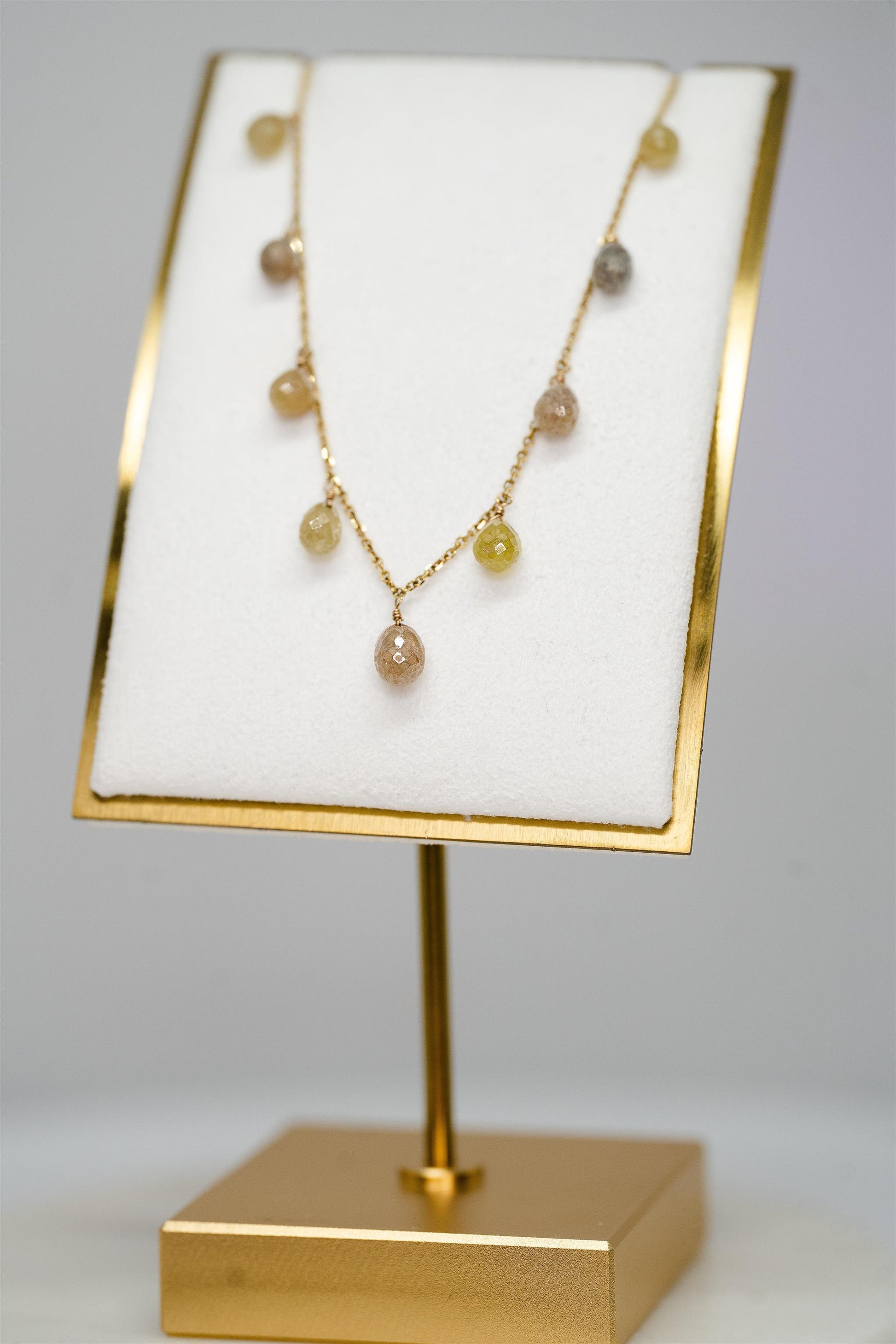 Yellow gold unique rough diamond necklace holding briolette cut rustic diamonds on an 18" necklace, all dangling from the chain in 14K gold. If you're looking for unique, or a great piece to dress up an outfit and standout, this is it!