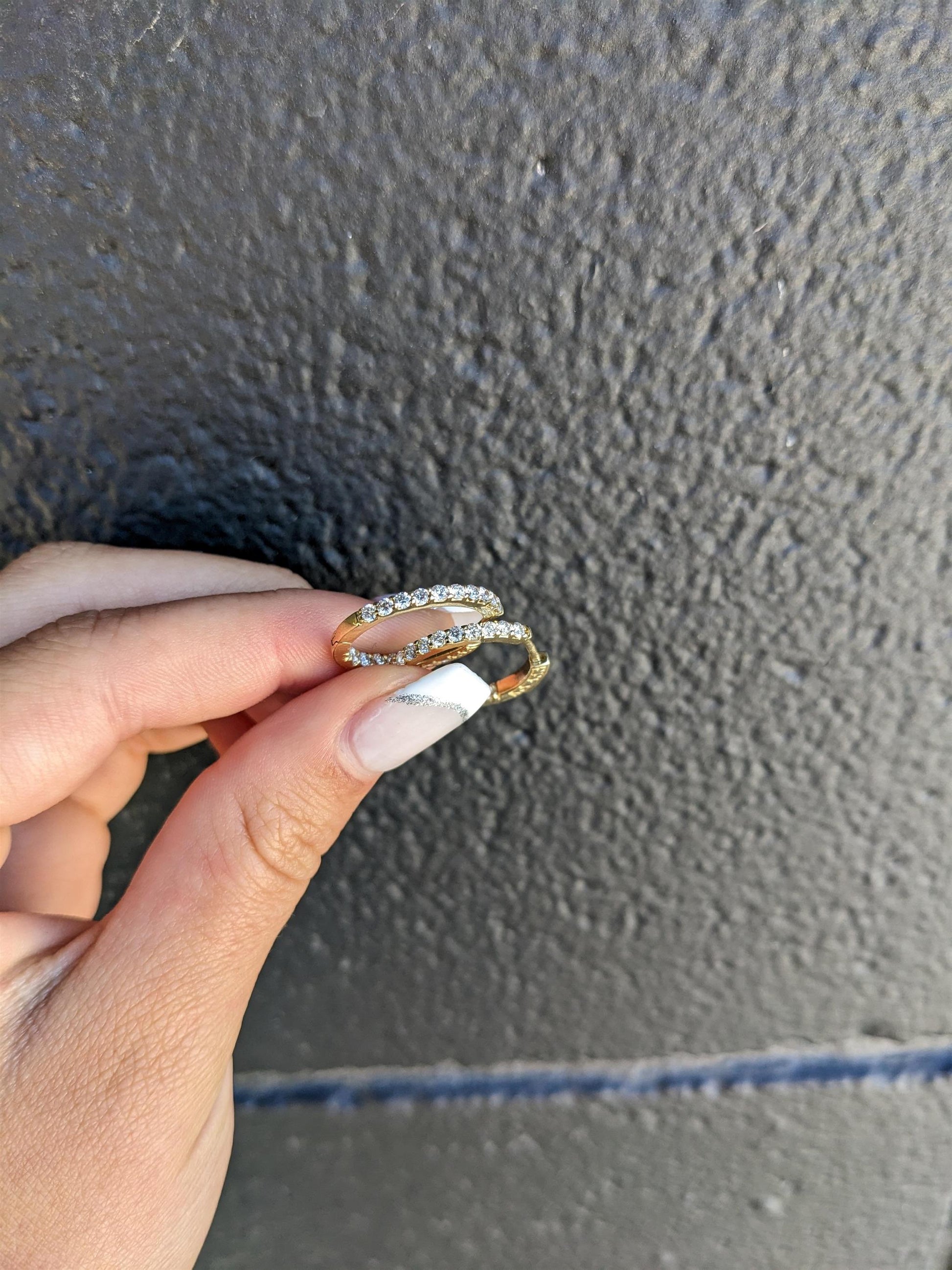 These are14K Yellow Gold Medium Inside Out hoops with small white diamonds throughout the inside and outside of the hoops. 1.00tdw