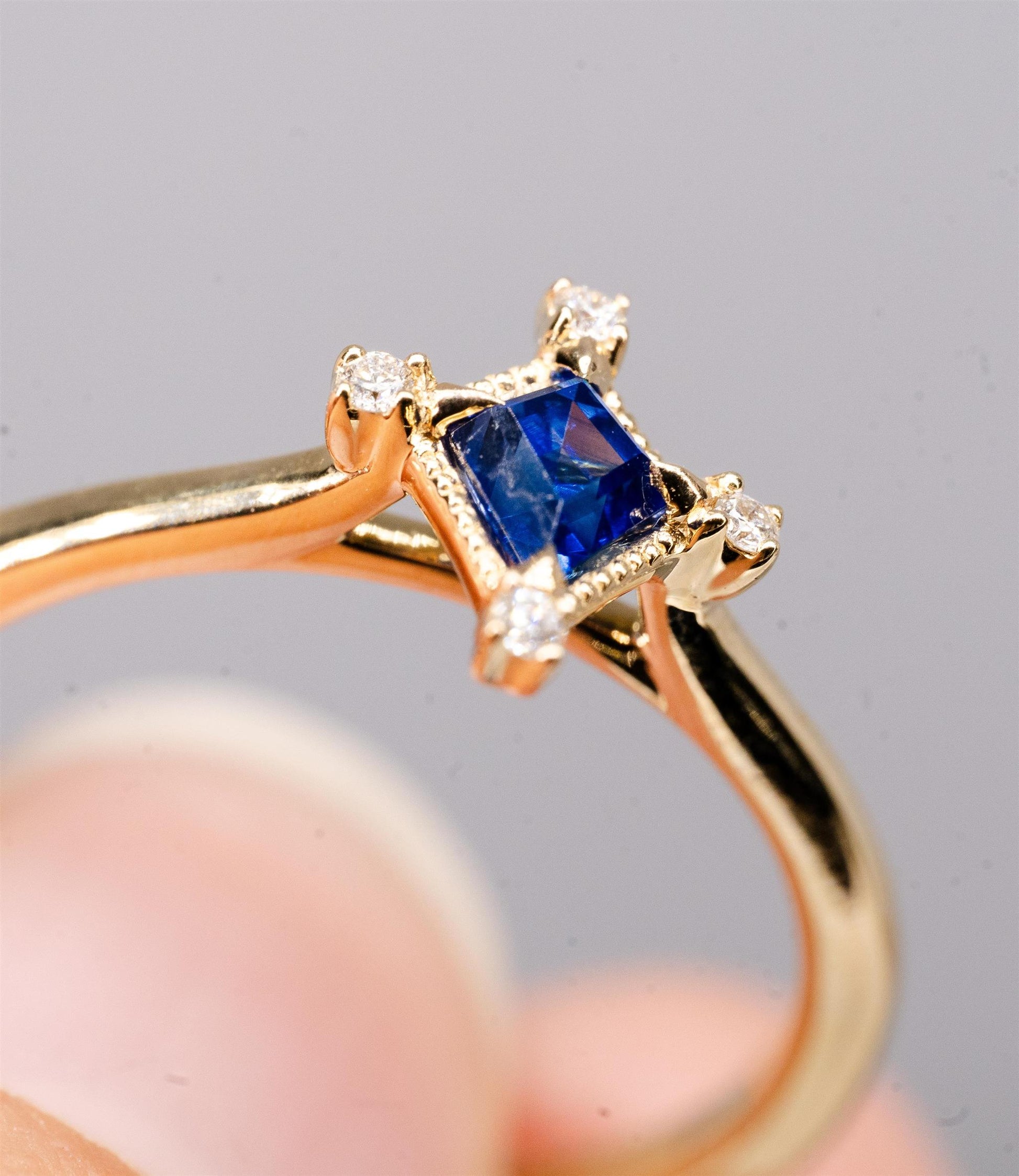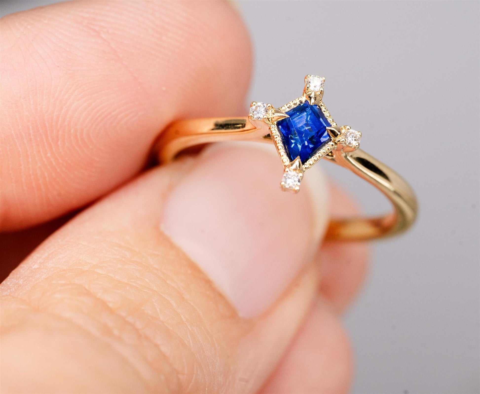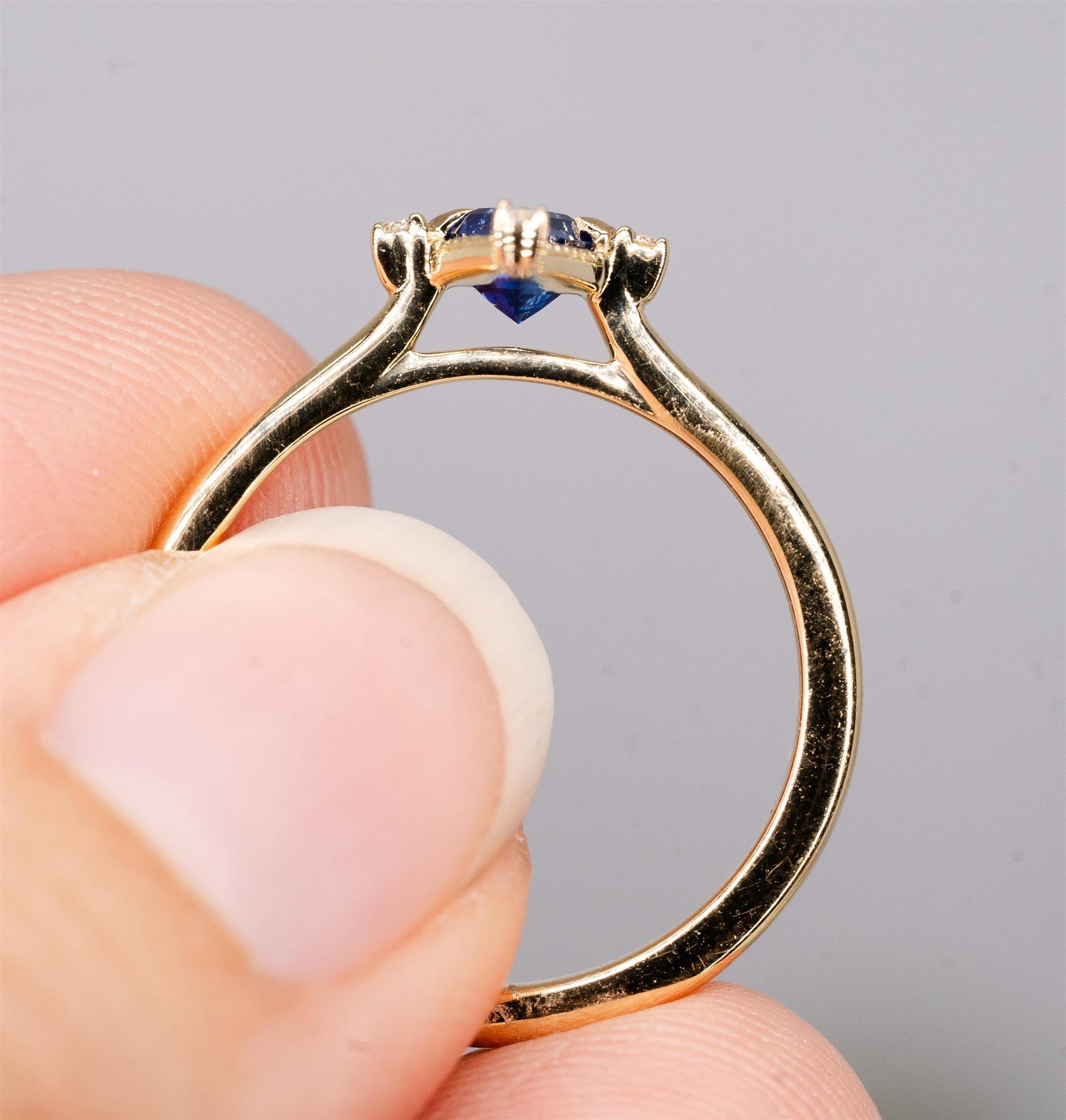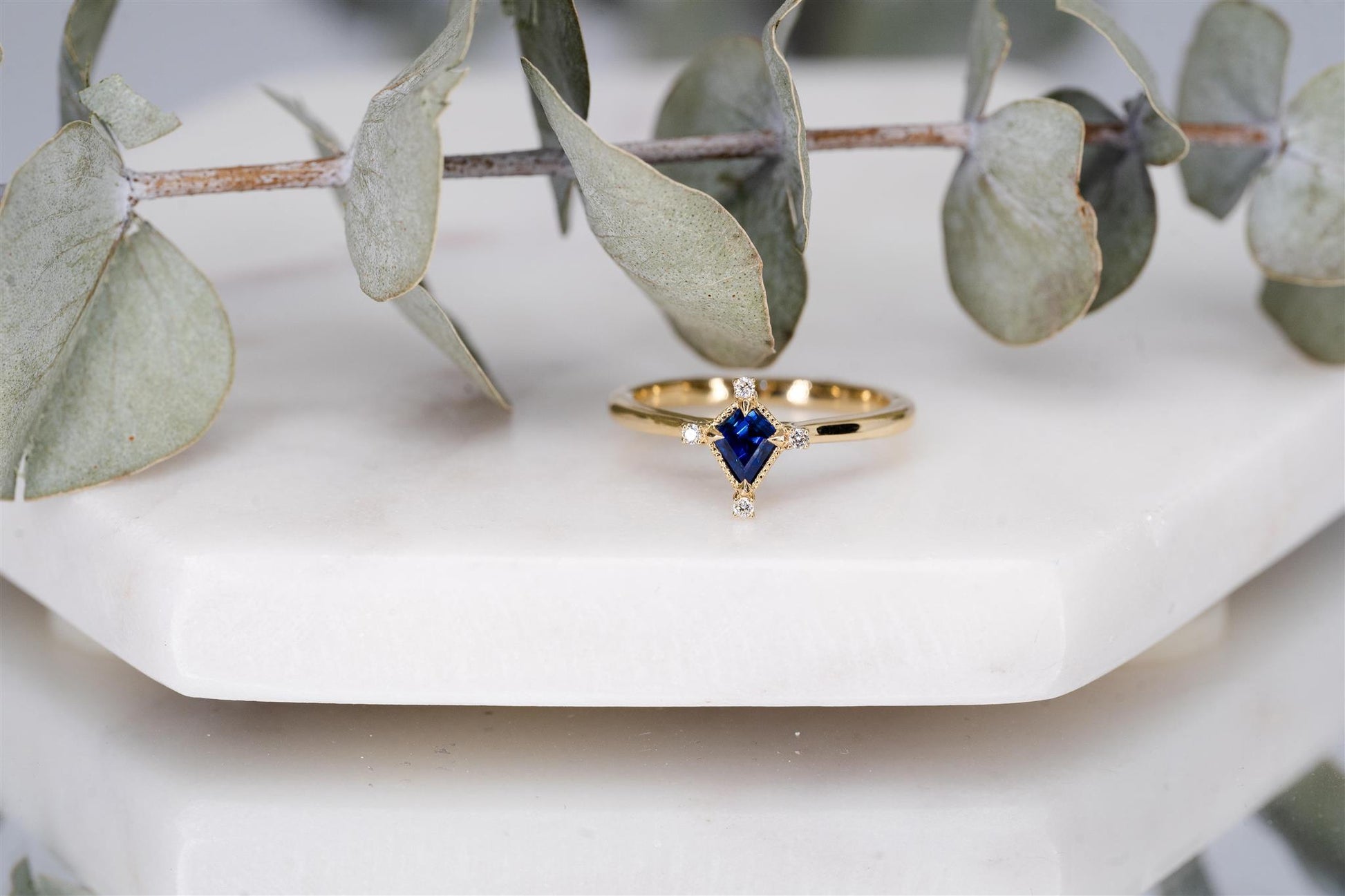 This is a Size 6.5, 14K yellow gold ring with a kite shaped, 0.60ct blue sapphire as the center stone. At each point of the Kite saped sapphire are 4 white diamonds. Diamonds are GH in color and SI in clarity. The sapphire measures 5.30x4.43x3.15 (Can be sized)