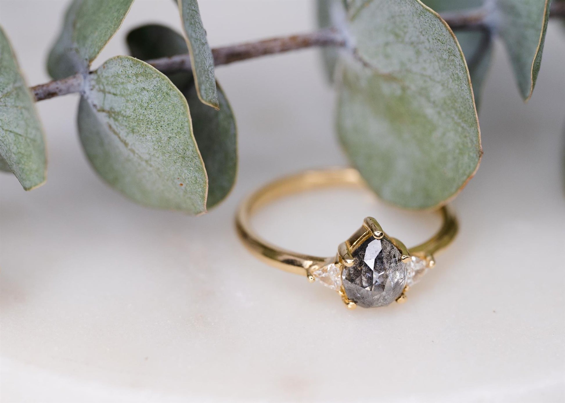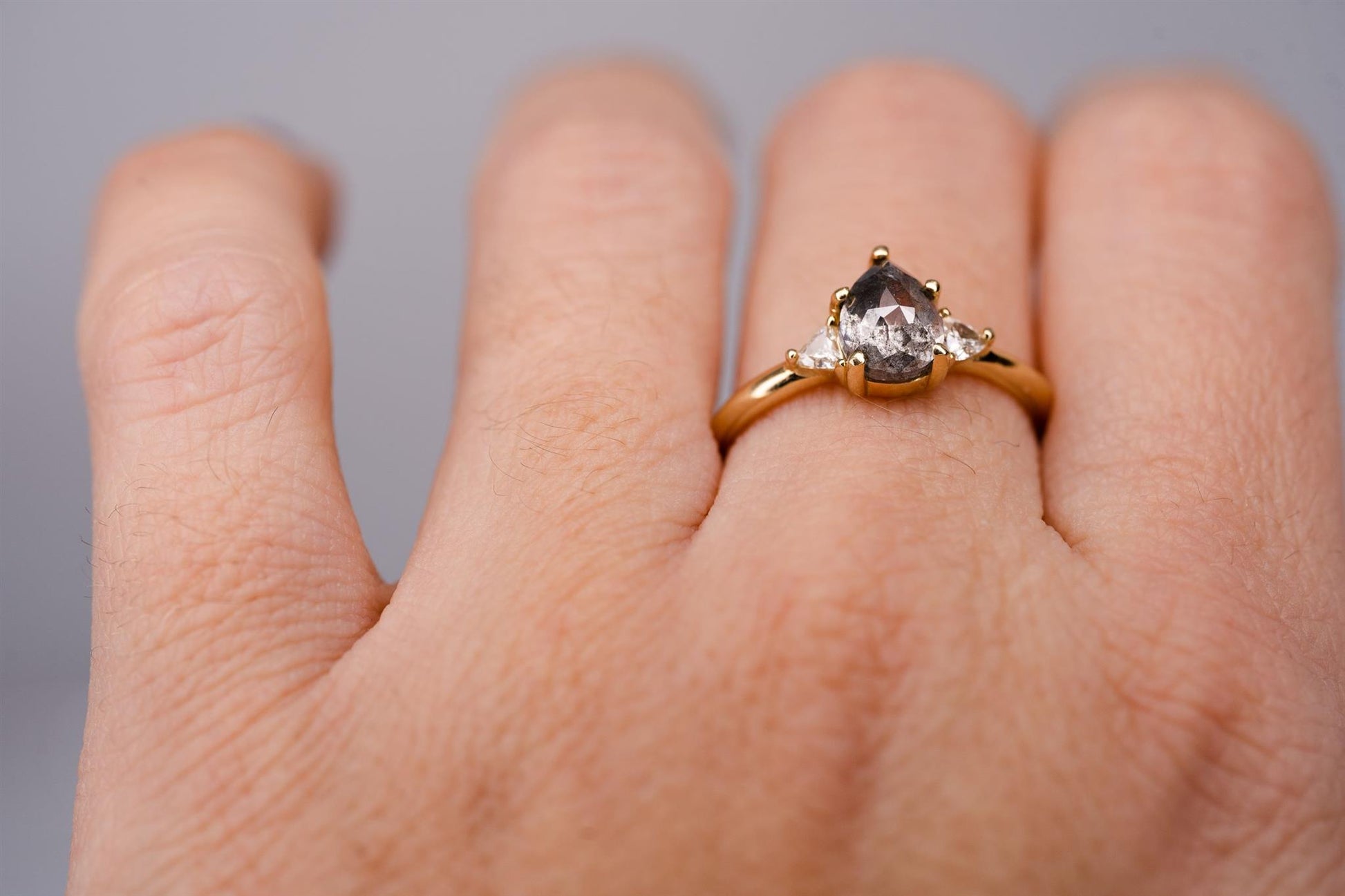14K yellow gold with a pear shaped salt and pepper diamond as the center stone measuring 7.18x5.73x3.98mm and weighs 1.43ct. There is a trillion cut diamond on each side of this center stone.
