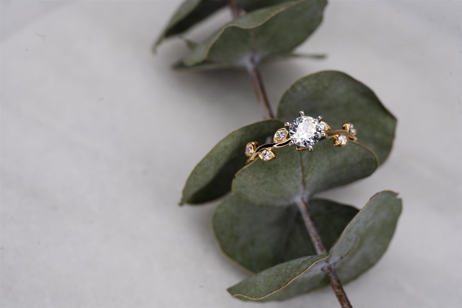 This 14K yellow gold semi mount ring has a vine/leaf design throughout the top half of the shank with 6 leaf shapes coming off the sides with a small round diamond in each leaf. In the top center of the ring is one white CZ stone in a 6 prong head. Total diamond weight on this ring is 0.12ct. This ring comes in a size 7 but can be comfortably sized up or down two sizes.