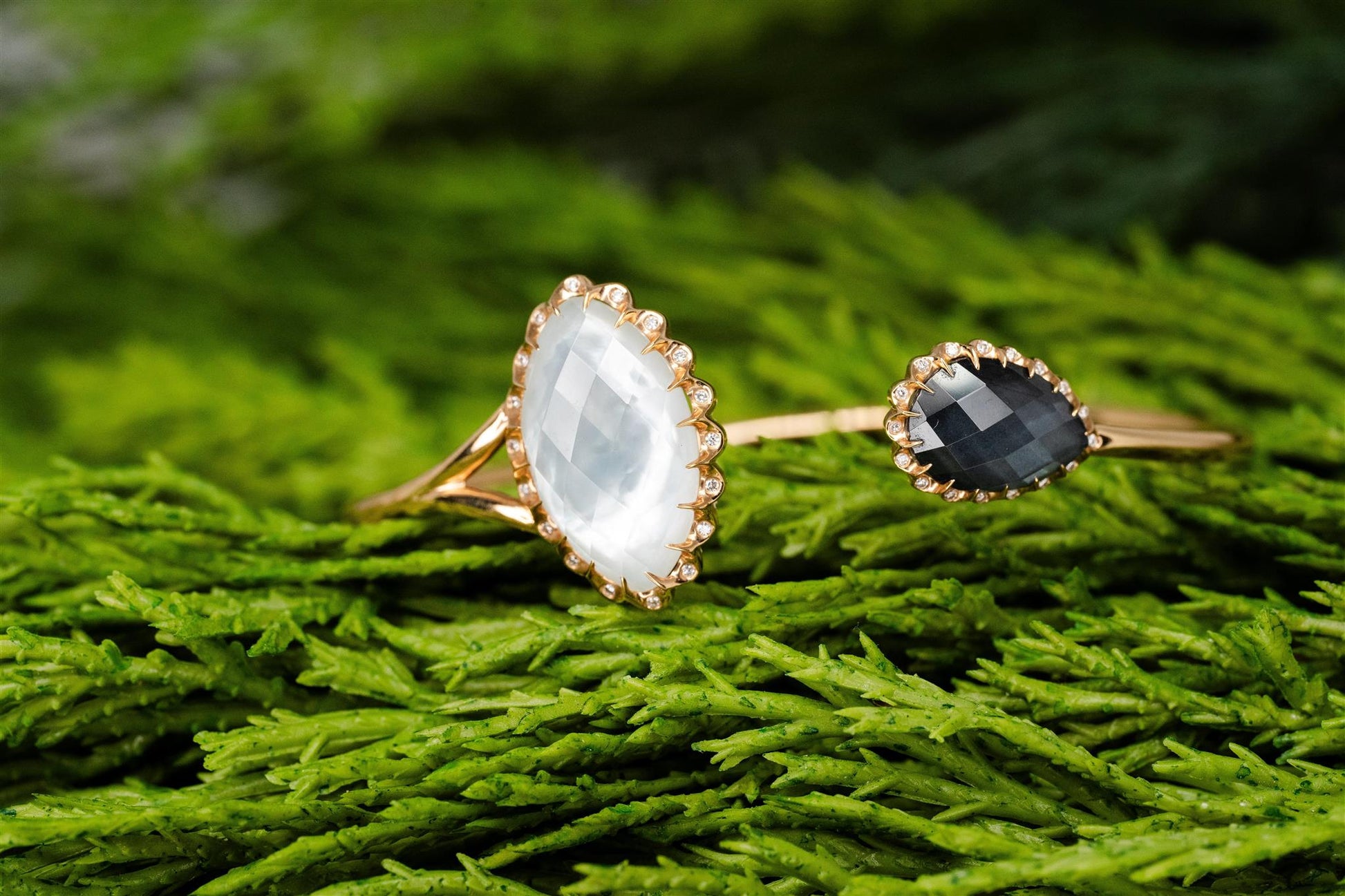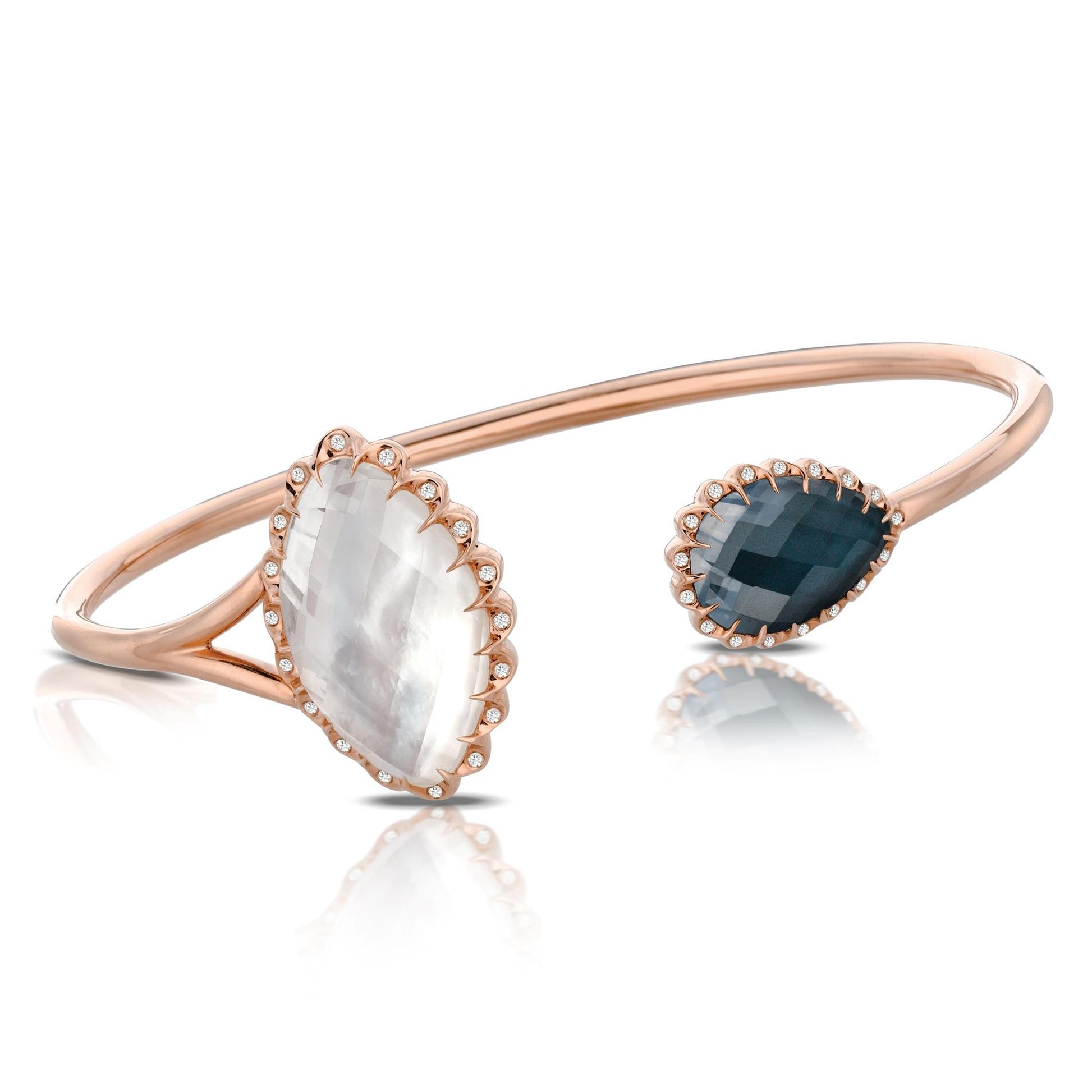 This sis a 18K rose gold bangle bracelet with diamonds around each of the two stones on the end. On one end of the bracelet is pear shaped white topaz over Hematite and on the other end is a marquise shaped white topaz over mother of pearl. Total diamond weight is 0.15ct, total white topaz over Hematite is 6.85ct and total weight of white topaz over mother of pearl is 11.92ct.