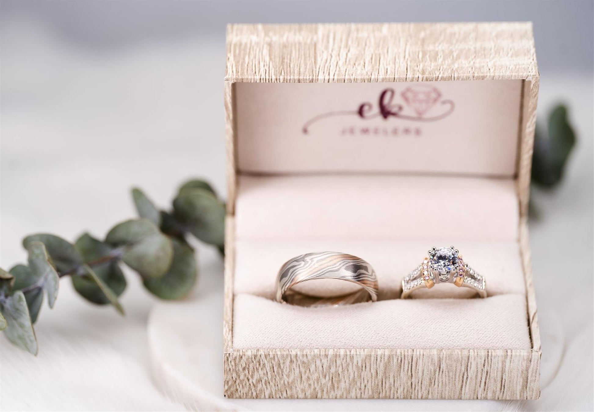 Chris Ploof - Mokume gane ring in Beech pattern with Palladium 500, silver and 14K red gold. Slightly rounded profile. Comfort fit interior. sz 11
