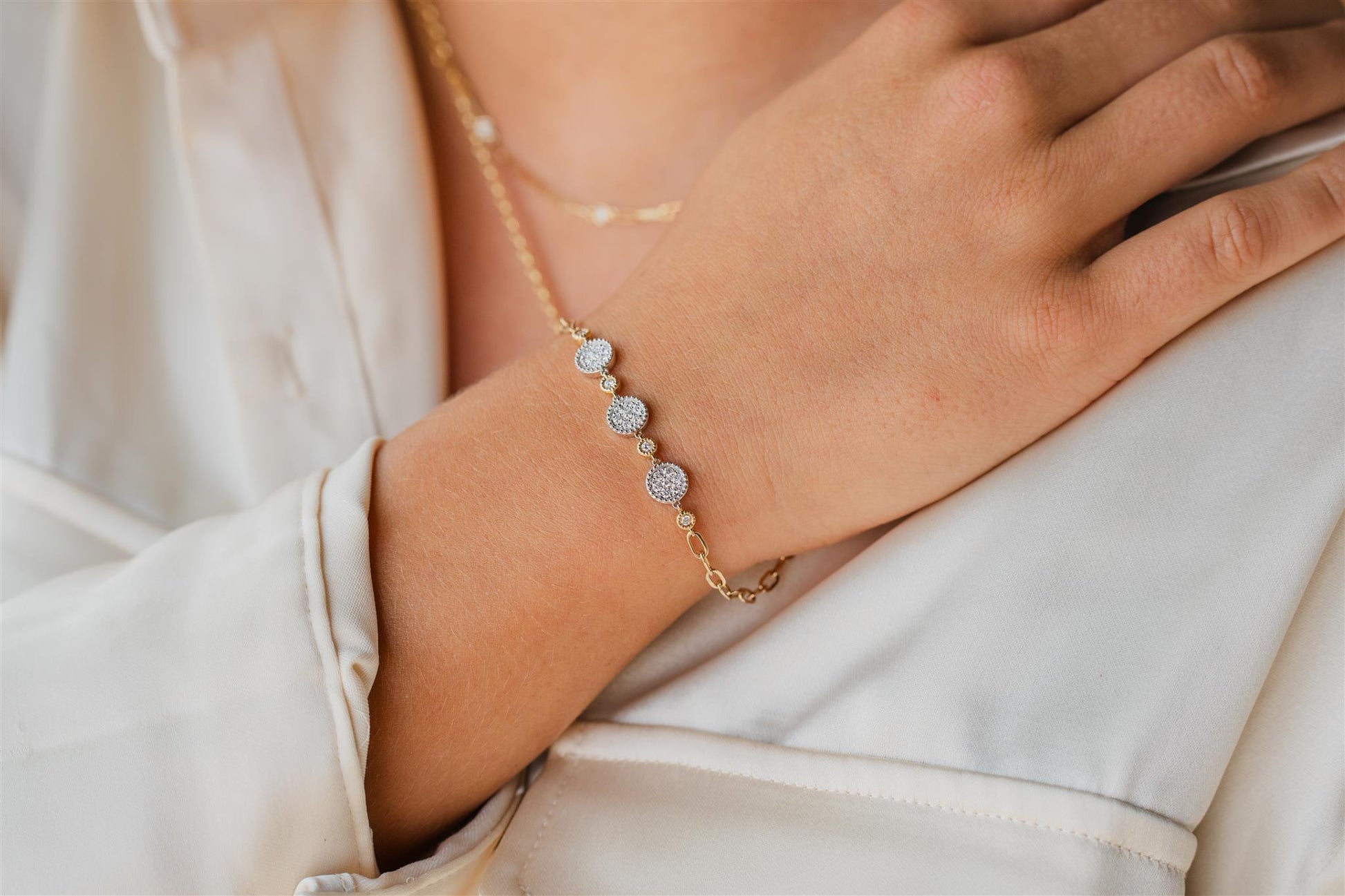 14k white and yellow gold Allison Kafuman bracelet. This bracelet has a paper clip chain in yellow gold, in the center of the bracelet are 3 bigger round clusters in white gold with milgrain around the edges, 7 round diamonds in each. Between the three circles are smaller diamonds each holding one, that are set in yellow gold with milgrain around the edge as well. Diamonds weighing a total of .48ct.
