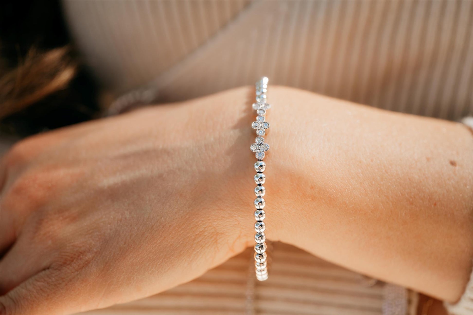 This is a14k white gold beaded style bangle bracelet with a small opening in the bac, it is a flexible bracelet, with 3 clovers at the top holding diamonds 0.48tdw.