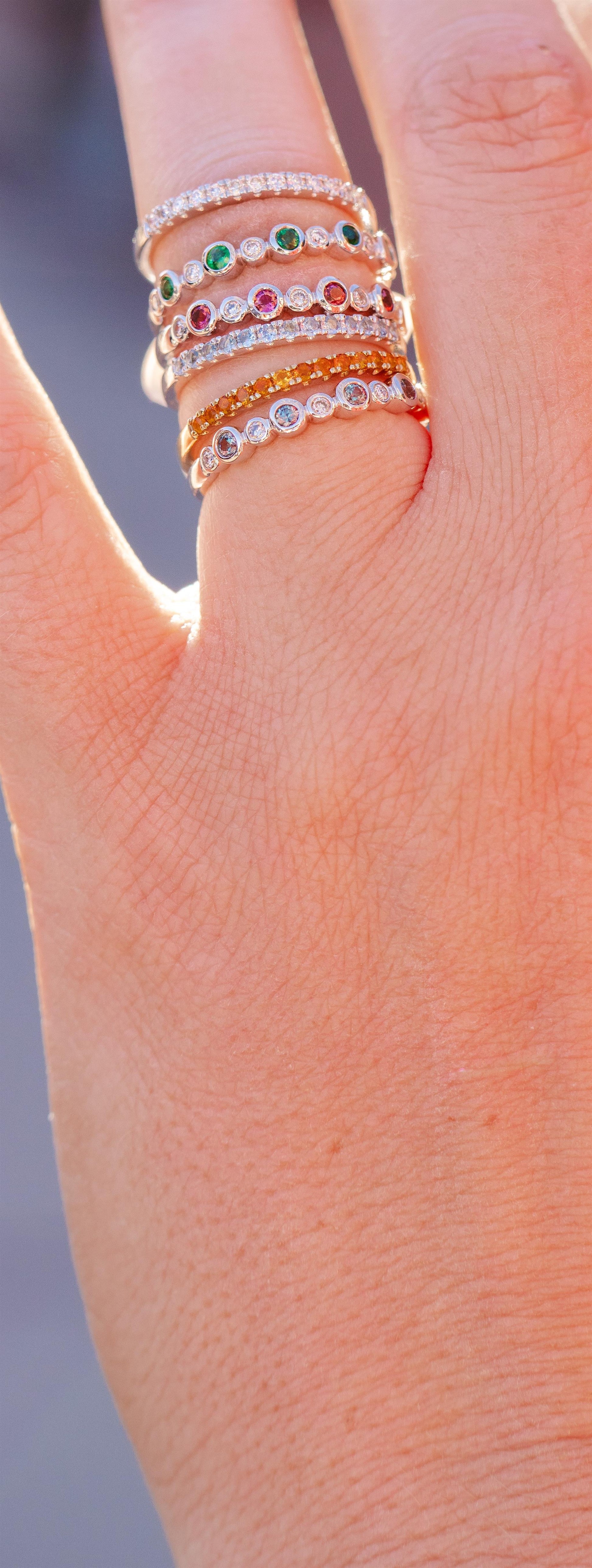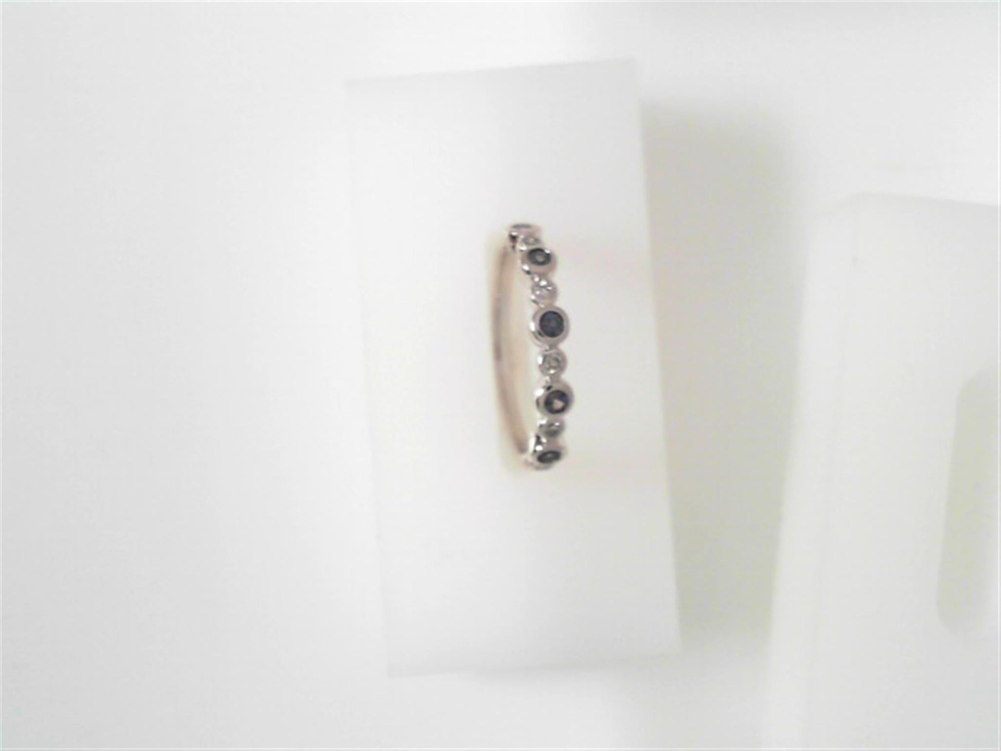 14k white gold ring that alternates larger CREATED alexandrites weighing a total of 0.20 carat and smaller diamonds weighing a total of 0.09 carat that are bezel set.