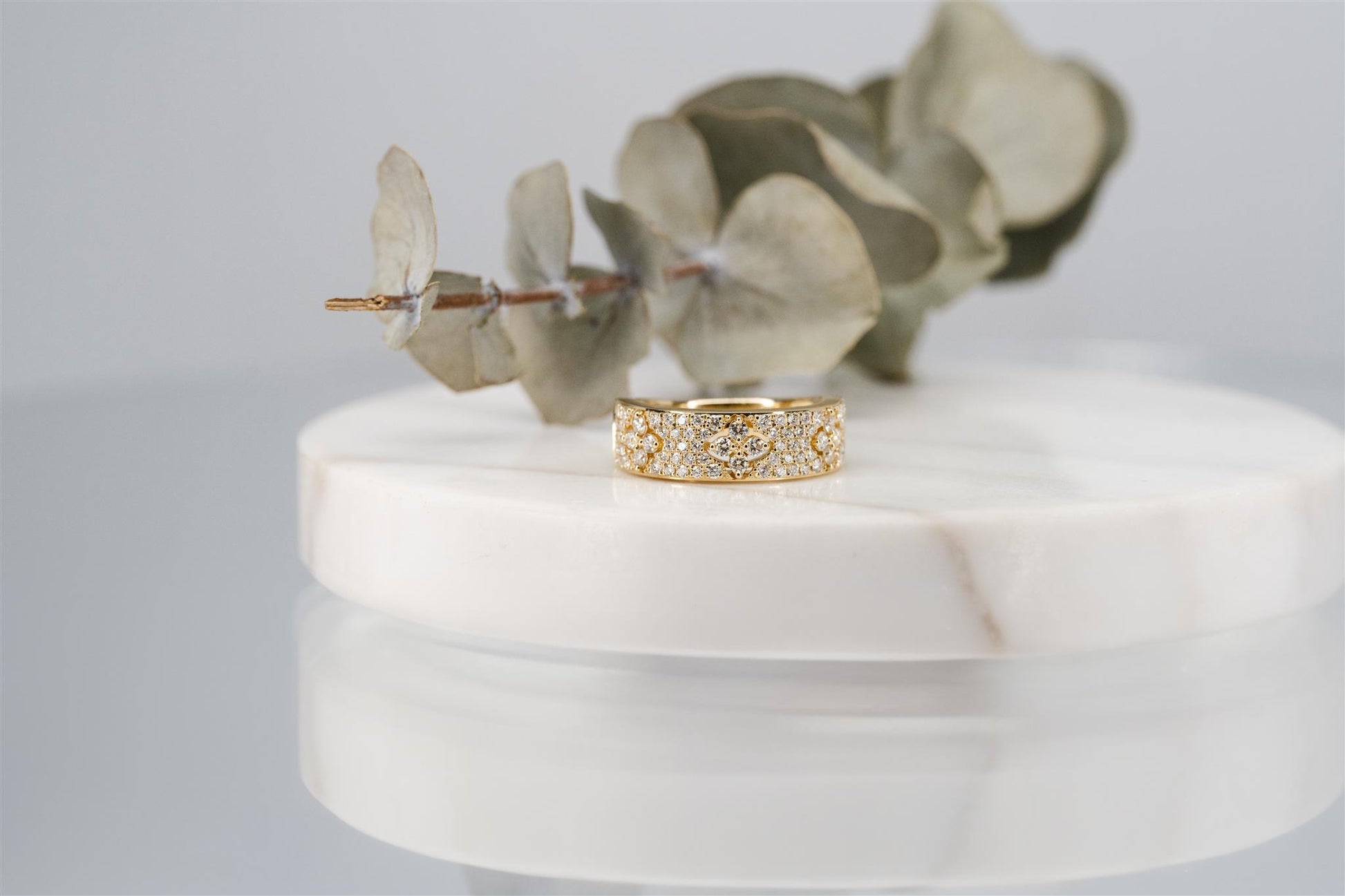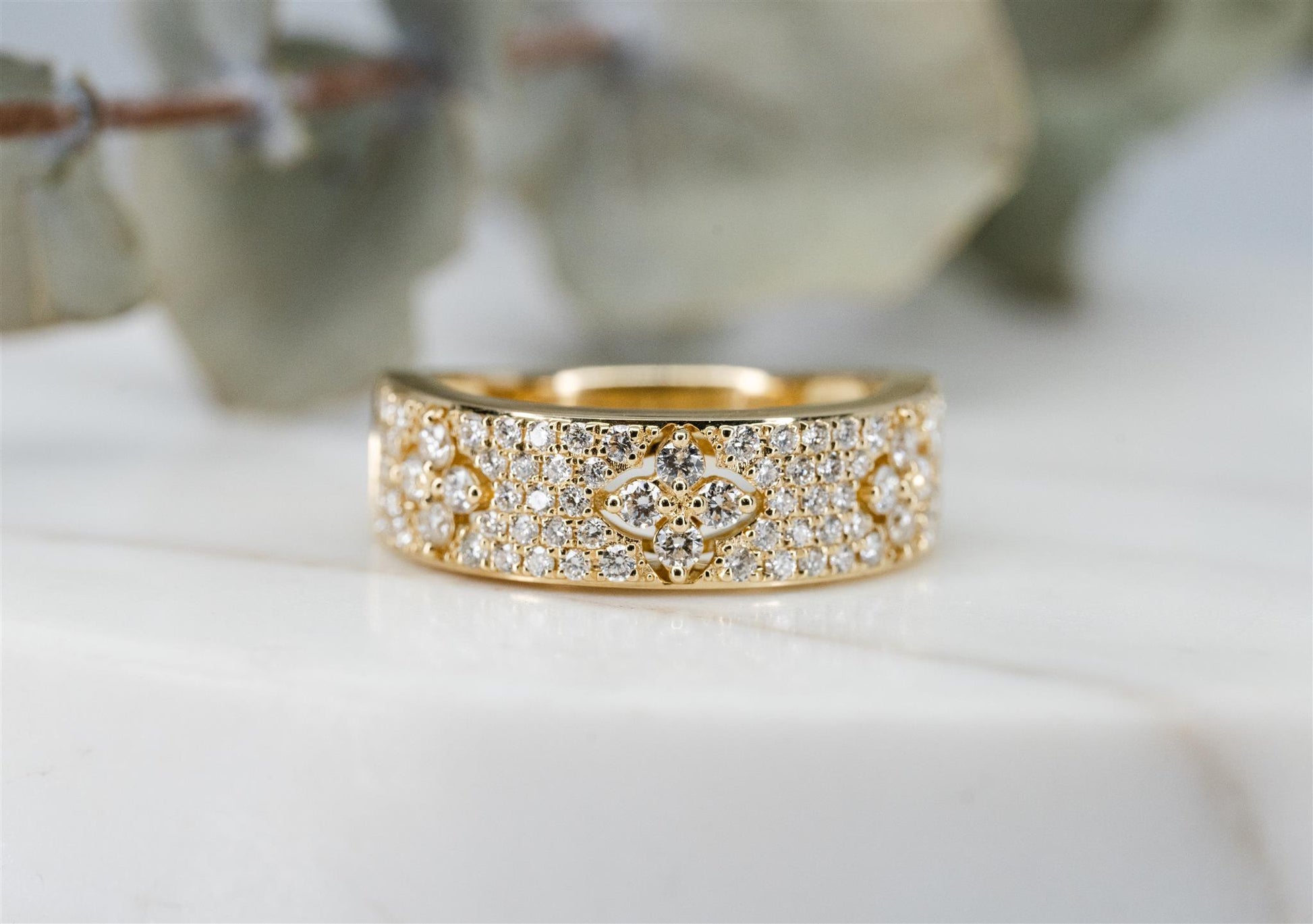 14k yellow gold polished ring that has 70- 1.04mm round channel set diamonds and in increments there are three open clover designs that are set with 4 round 1.65mm in each clover. There are a total of 82 rounds diamonds with a .77ctw. The band is 6.53mm wide x 3.5mm deep and it tapers to 3.4mm wide x 1.54mm deep. The underneath of the diamond area is open and has a criss cross gold bar pattern.