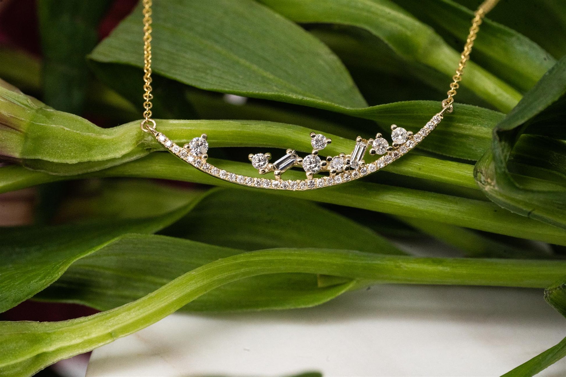 A yellow gold necklace with a diamond bar set in 14k yellow gold in the shape of a "smile" that includes 35 round diamonds. 9 Round and baguette diamonds clustered on top of the smile.