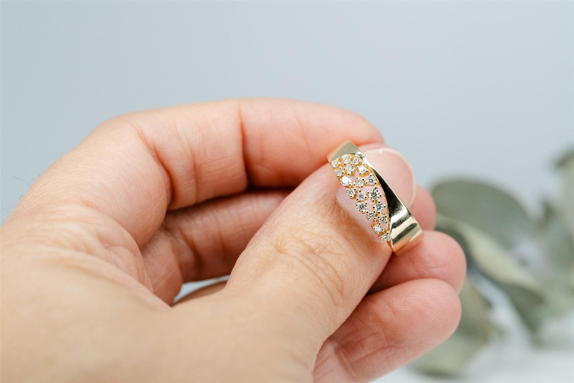 14k yellow gold polished ring that is set with 18 round 1.5mm and below diamonds for a .21ctw. They are four prong set in a cluster, the band is 6.34mm at the front and tapers to 3.22mm.