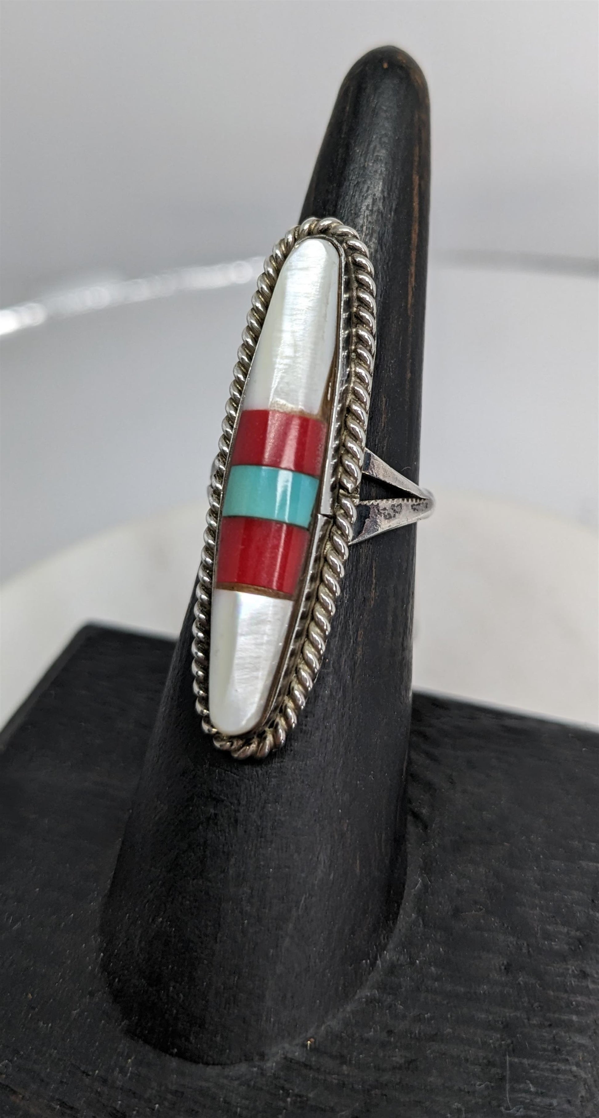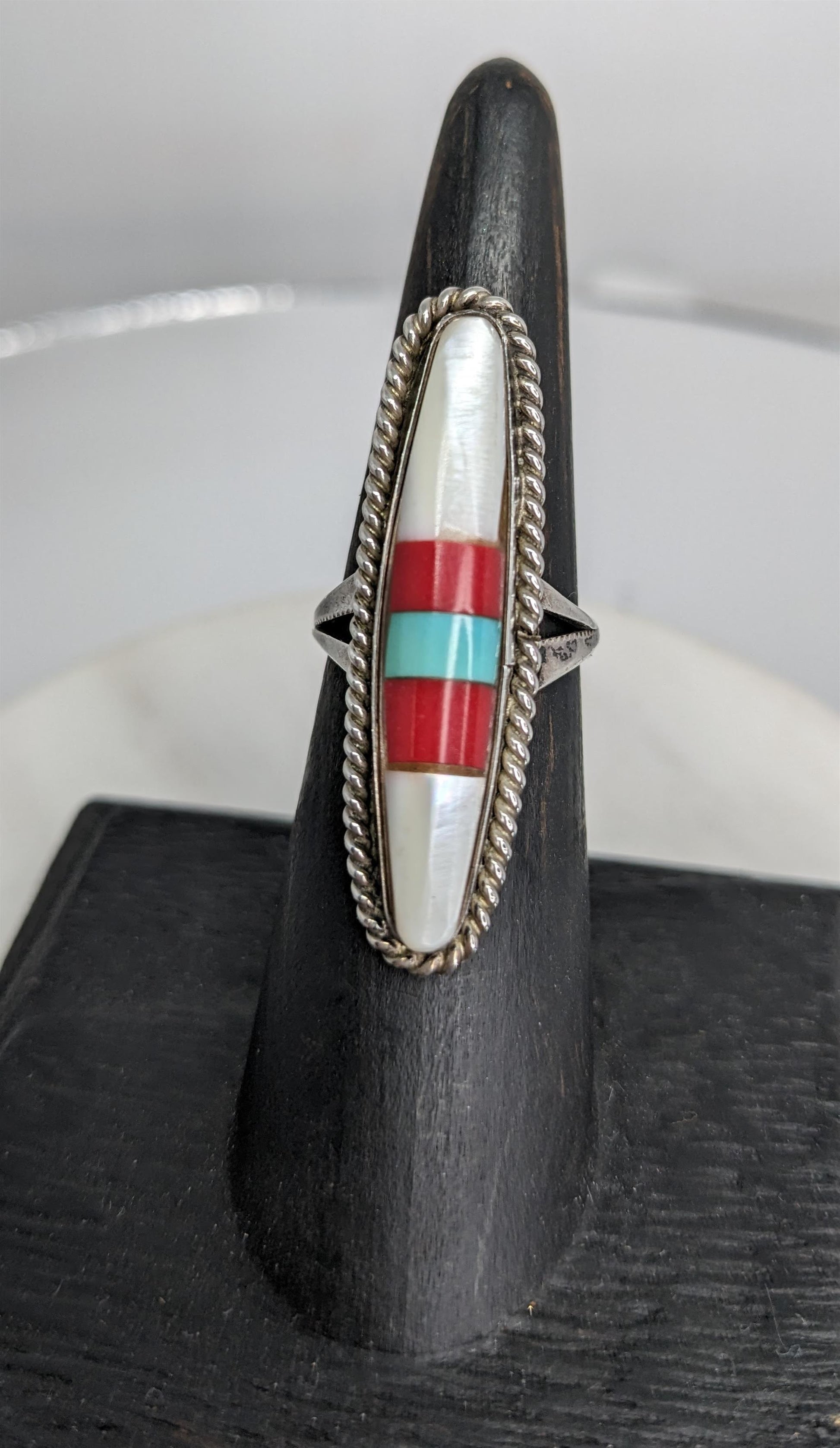 Long skinny ring with inlay mother of pearl on each end, then coral and lastly a piece of turquoise in the center with a split shank in a size 5
