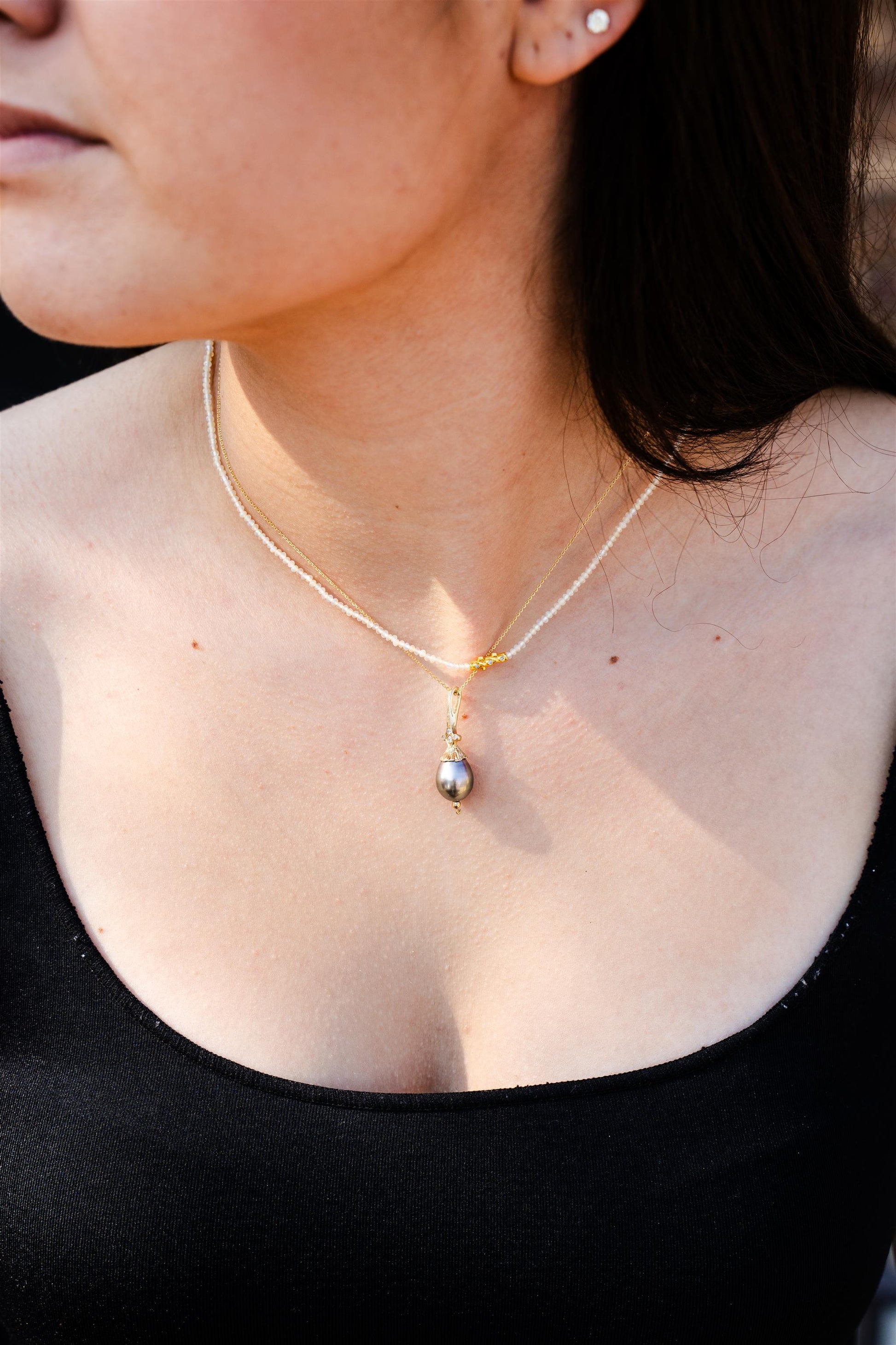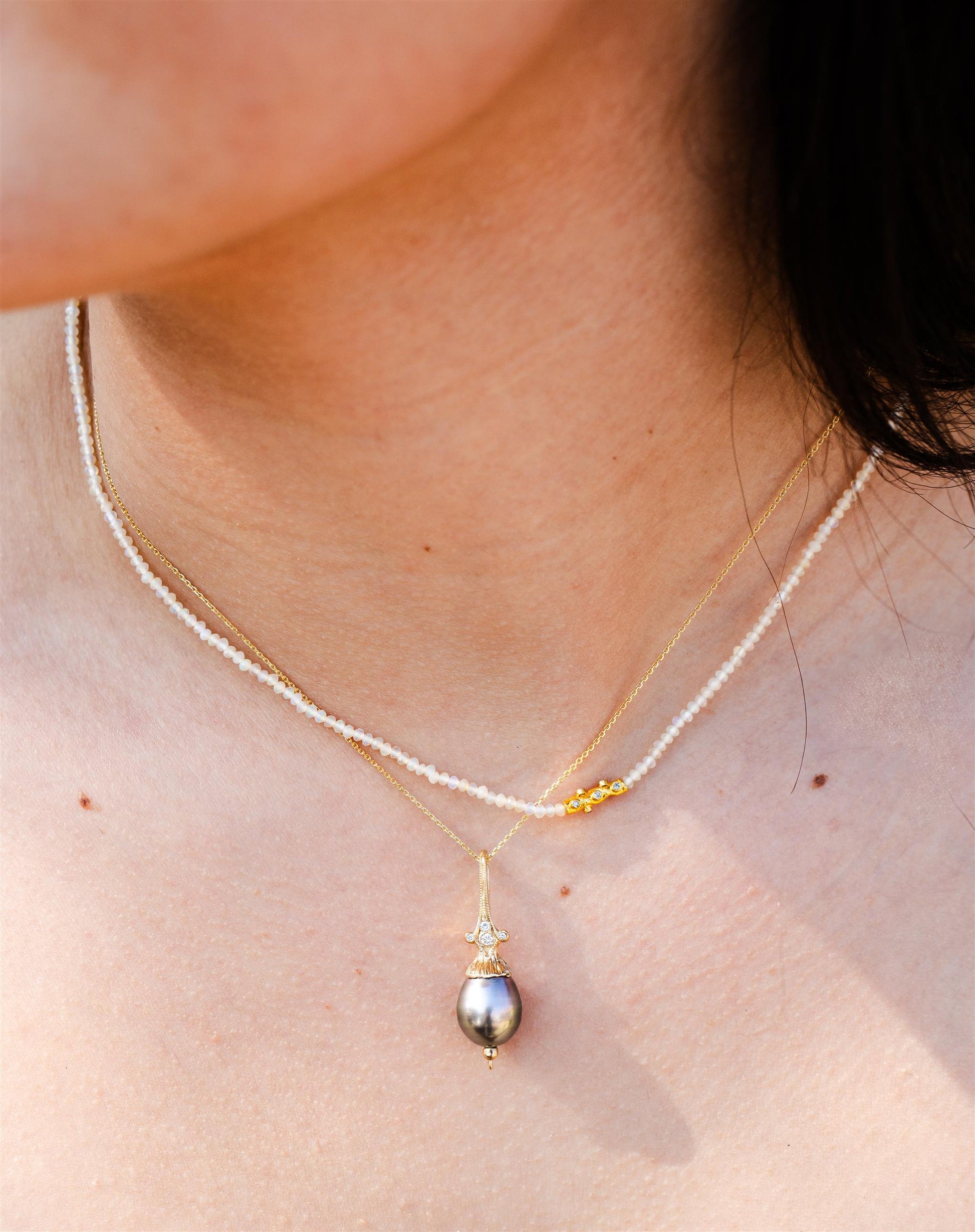 14k yellow gold pendant bail holding a tahitian drop pearl with a drill all the way through and a gold bead and loop on the end for design. There are 4 diamonds set above the pearl in a victorian design up the the bail and milgrain edging. Pendant only.