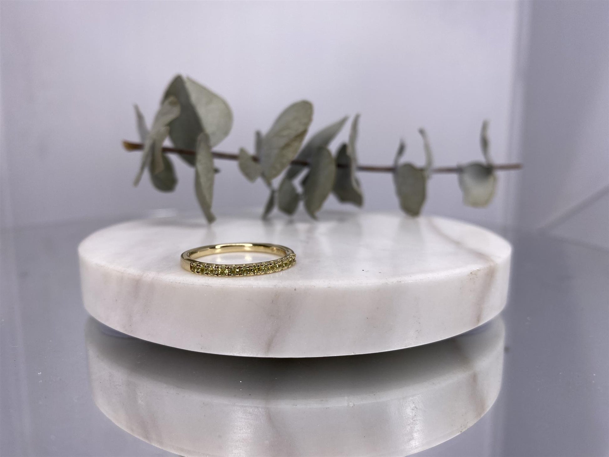 14k yellow gold straight band that has peridot that weigh a total of 0.27 carat.