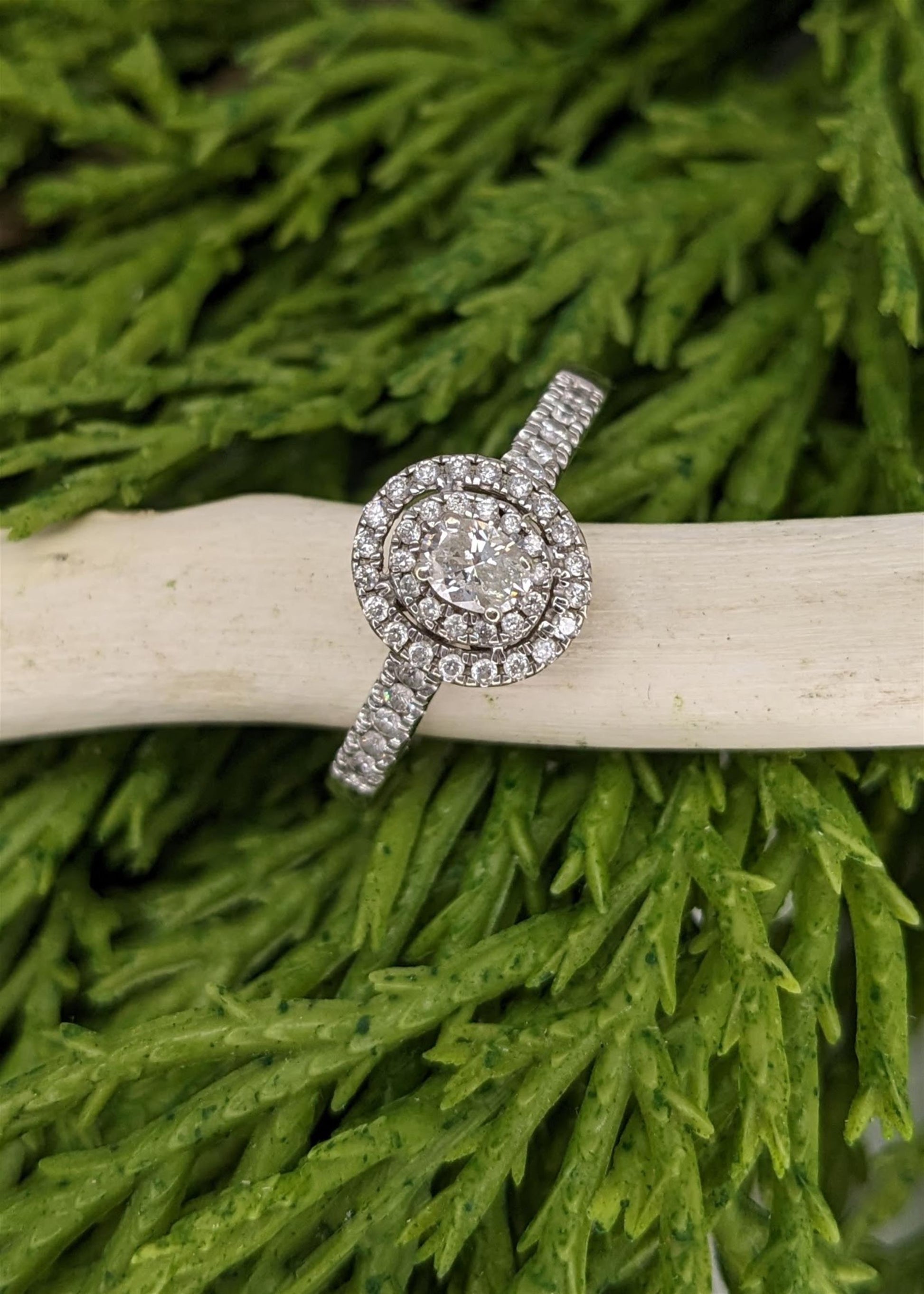 14k White gold ring with center oval diamond that has double halo of diamonds surrounding center. .50ctw
