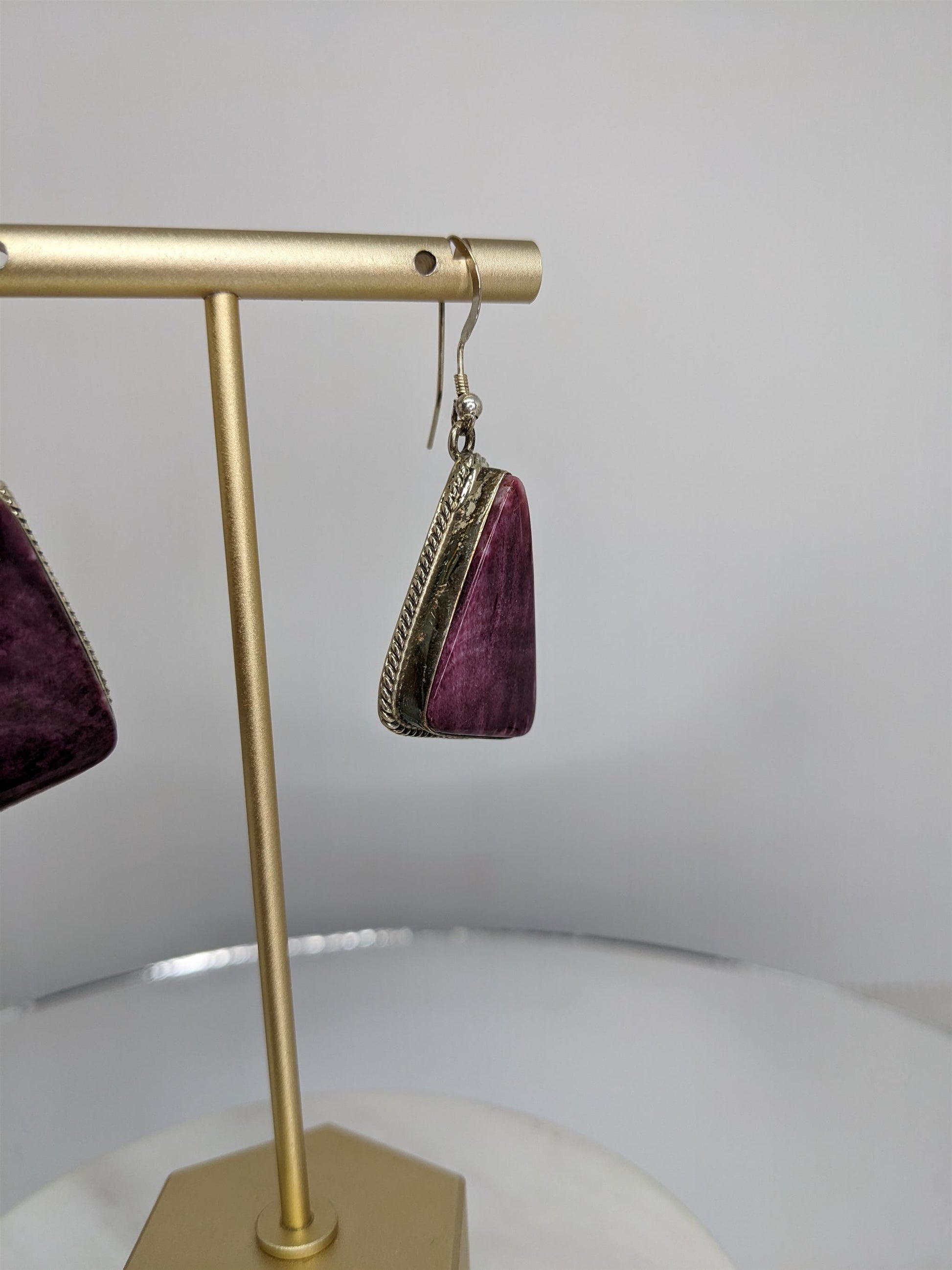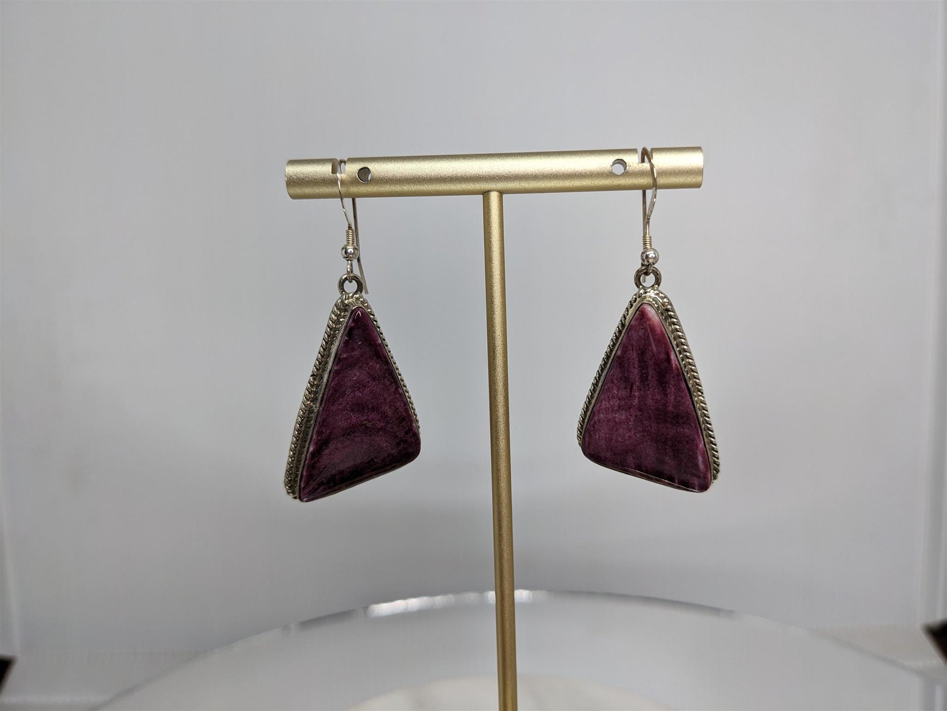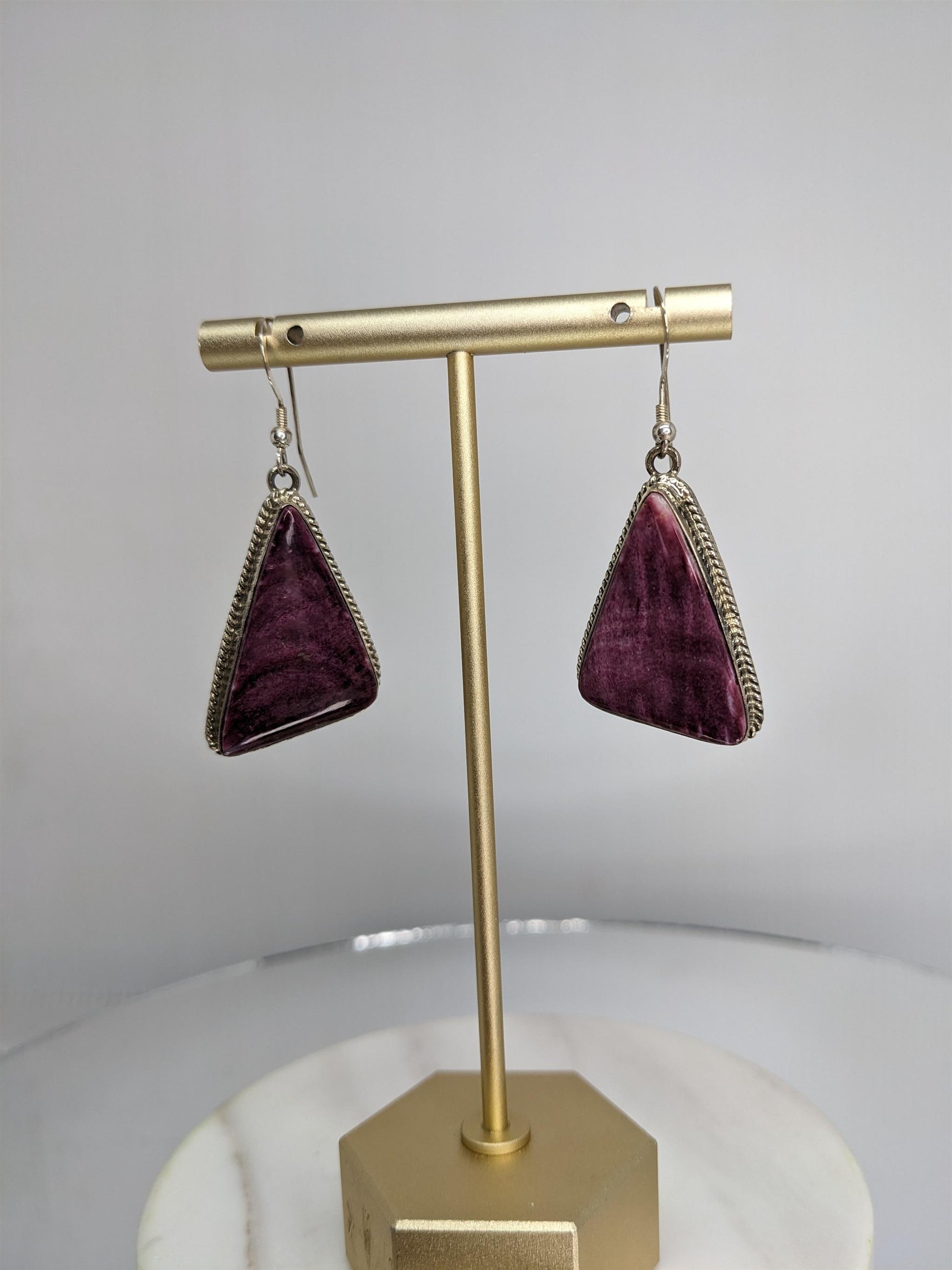 Sterling silver drop purple spiney oyster bezel earrings with a rope around the bezel