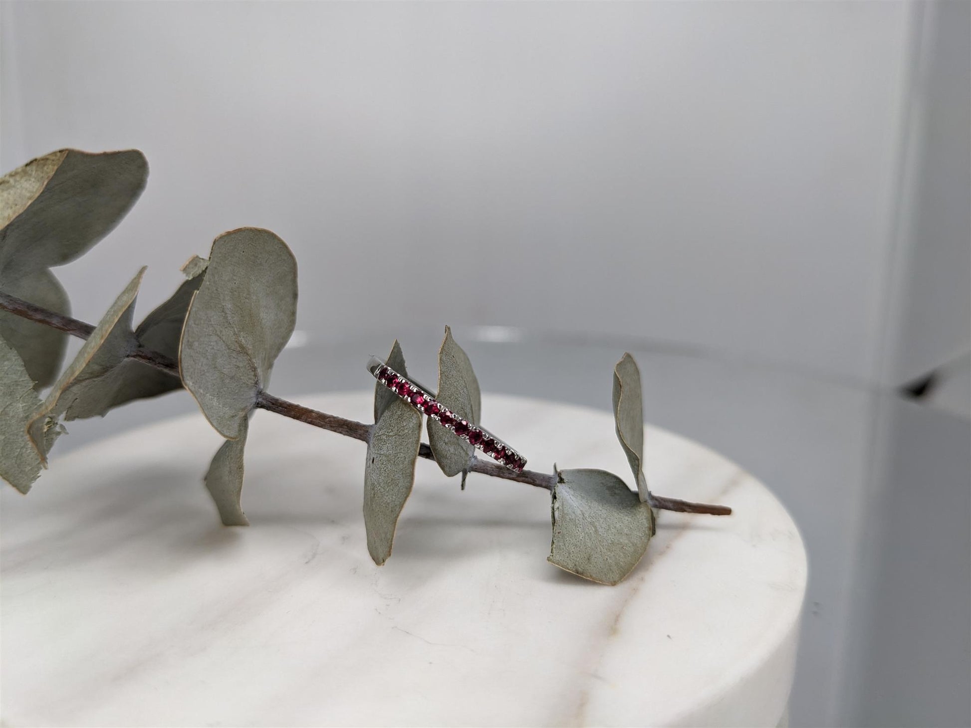 14k white gold straight band that hsa 0.29 carat of rubies.