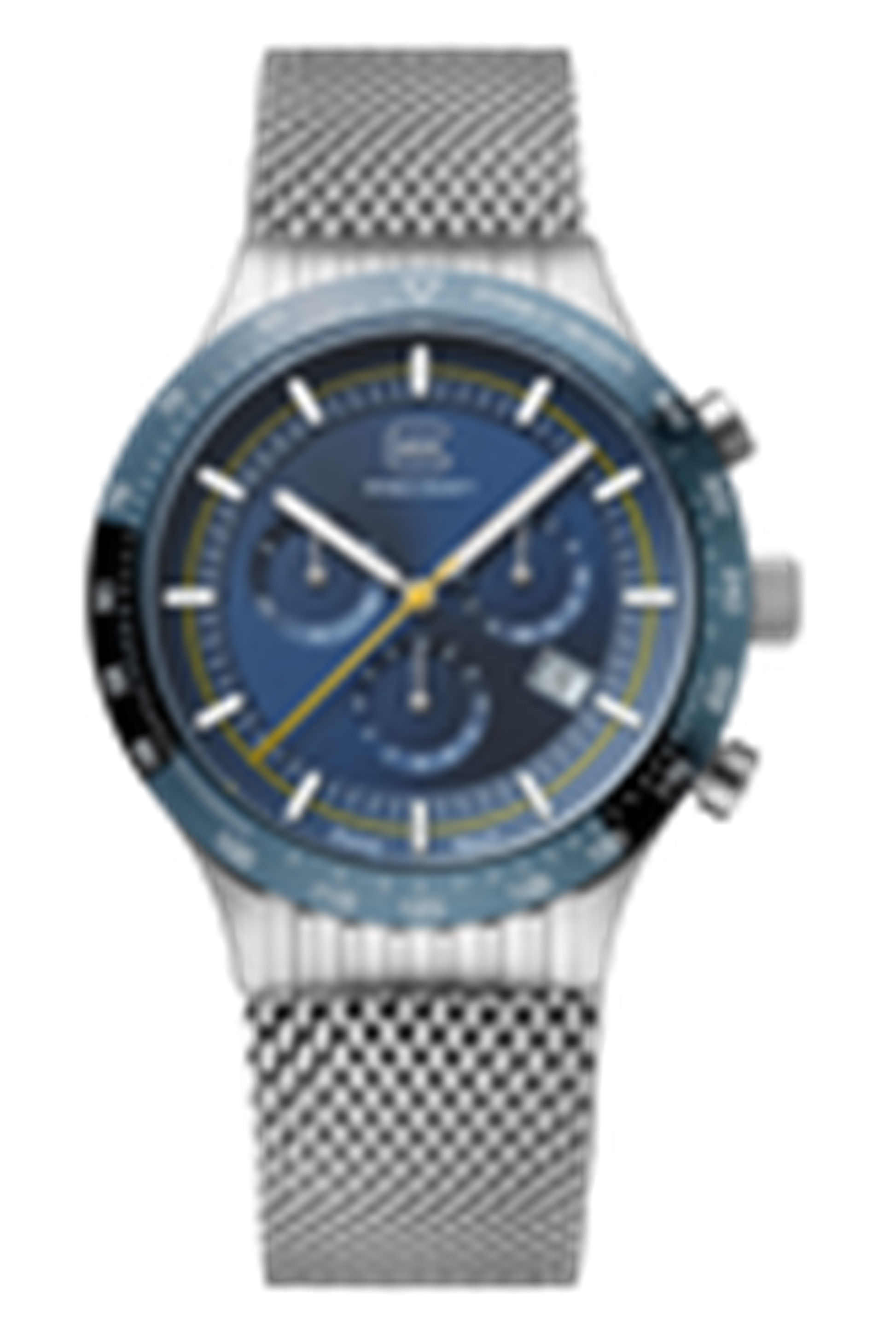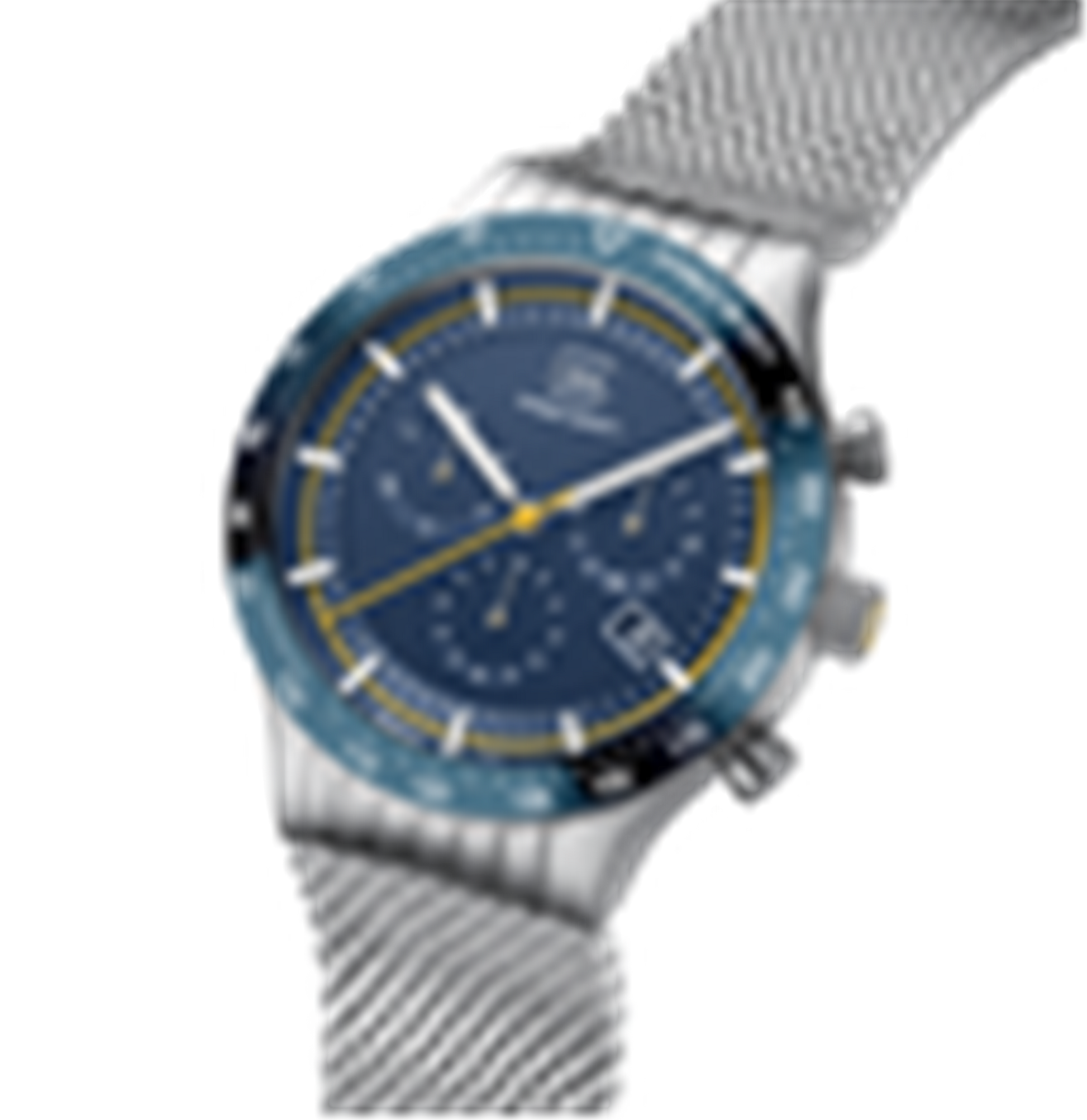 The brushed stainless steel case, emphasized by a polished blue bezel, complements the silver-tone mesh strap. The blue dial is protected by scratch-resistant sapphire crystal and features hands and indices with Swiss Super-LumiNova®. Driven by a Swiss movement and featuring a 20 ATM water-resistance rating, this watch combines precision and durability.
