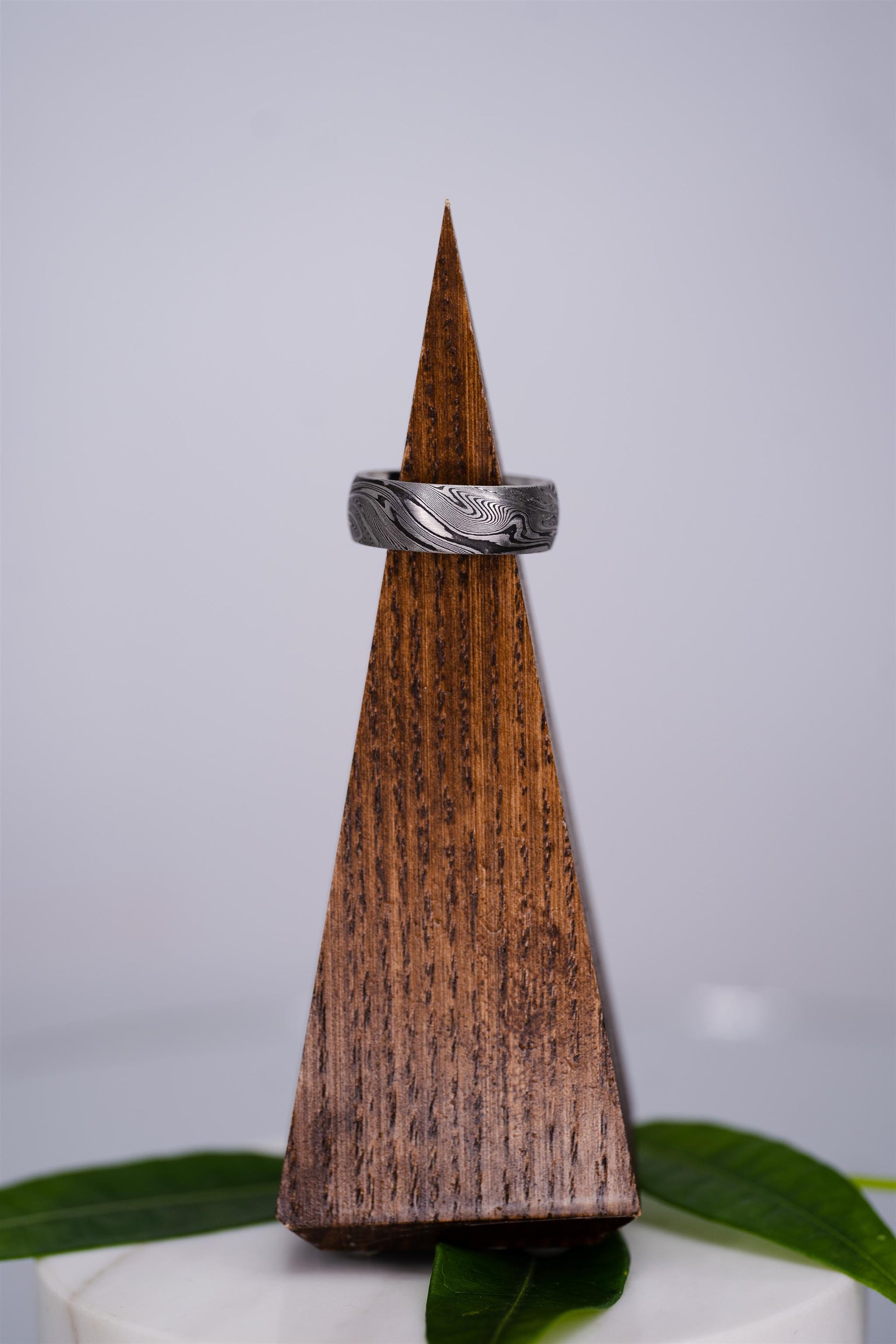Chris Ploof Designs - Damascus stainless steel ring with etched exterior and polished interior. Supernova pattern. Oxidized. Slightly rounded profile. Comfort fit interior. Size 11.