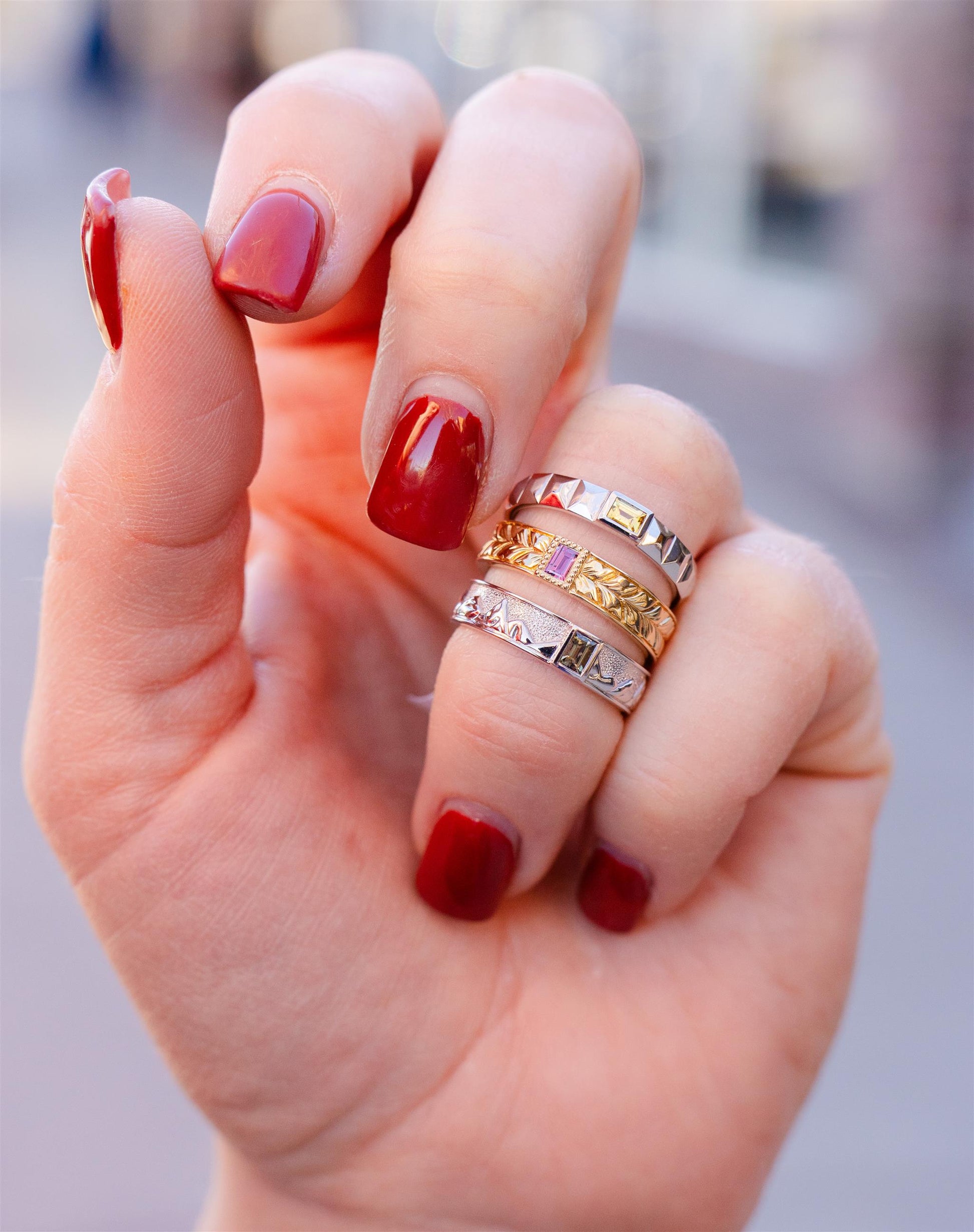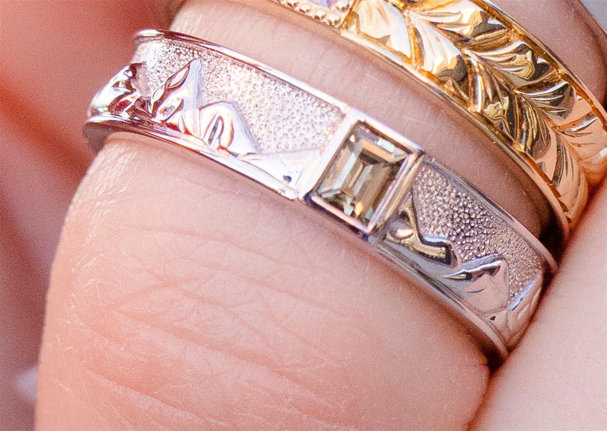 14k white gold band that is pyramid shaped all around and polished it has a yellow sapphire that measures 2mm x 3.5mm and is bezel set.